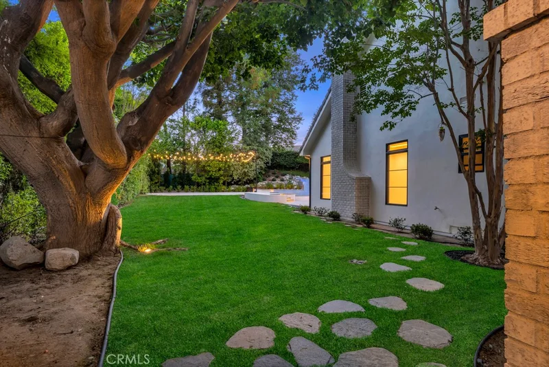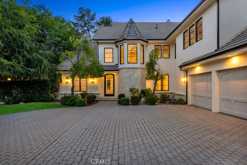 Set within a private gated community, this Modern Tudor estate on a cul-de-sac, has been completely reimagined, blending timeless architecture with modern luxury. Spanning 4,720 square feet—including a 400 sq. ft. enclosed patio— on an 18,317 sq. ft. flat lot, the home offers 5 bedrooms, 5 bathrooms, and a separate office, thoughtfully designed for both elegant entertaining and comfortable everyday living. A grand two-story foyer makes a striking first impression, leading to expansive light-filled interiors. At the heart of the home, the gourmet kitchen showcases Taj Mahal quartzite countertops, custom cabinetry, and professional-grade appliances. The kitchen flows seamlessly into a family room with coffered ceilings, creating a warm and sophisticated gathering space. A separate formal living room and dining room with designer-detailed ceilings add to the home’s refined character and provide ideal settings for entertaining. Three fireplaces throughout the home—located in the family room, living room, and primary suite—add timeless charm and comfort. The primary suite serves as a private retreat with a spa-like bathroom featuring designer finishes and a very spacious walk-in closet. Additional bedrooms are spaciously sized and versatile, ideal for family or guests. The dedicated office provides a quiet, professional space for today’s lifestyle needs. The private entertainer’s yard offers resort-style living with a sparkling pool and spa featuring waterfalls, a fully equipped BBQ island with ample seating, an outdoor kitchenette, and multiple lounging areas. Elaborate landscape lighting and a large grassy play area make this backyard a true oasis for family and friends. Additional highlights include white oak flooring, designer lighting, and an integrated smart-home system with security cameras, speakers, and a car charging port. An attached 3-car garage adds convenience and security. This Modern Tudor estate offers unmatched privacy, sophistication, and resort-style living.