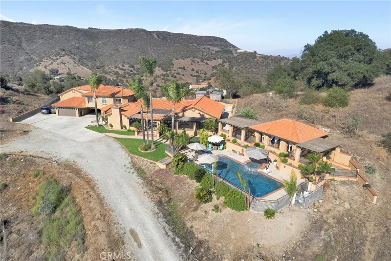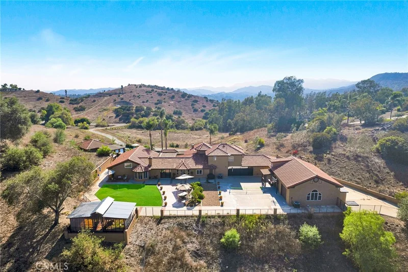 Welcome home to this stunning Mediterranean-inspired estate, set amidst the breathtaking views of Temecula Wine Country. Nestled on 8.63 peaceful acres of rolling land, this property offers the perfect balance of tranquility and luxury. The main home spans a generous 3,579 square feet and has recently undergone an extensive, high-end remodel. It features a beautifully appointed main-level primary suite, a junior suite, a guest bathroom, and a separate laundry room with ample storage. Upstairs, you’ll find an additional suite with two bedrooms, each with its own closet, and a shared full bathroom. The heart of the home is the chef’s kitchen, complete with top-of-the-line appliances, stunning "Knotty Alderwood" cabinetry, sleek granite countertops, and a cozy breakfast nook. The great room boasts a stately Venetian plaster-style fireplace, while the formal dining area offers the perfect setting for dinner parties. Step into the living room with a second fireplace, adding elegance to the living spaces. Throughout the home, you’ll enjoy beautiful engineered hardwood flooring, complemented by gorgeous tile and stone accents in the bathrooms. Multiple patios, including an expansive covered patio system, provide plenty of space for outdoor living. The outdoor cabana-style room with a mounted TV is perfect for entertaining, while the uncovered firepit patio overlooks your sparkling pool and spa—ideal for relaxing and unwinding. For extra versatility, an attached bonus room near the covered carport offers a great space for additional sleeping quarters, a gym, or a flexible room to suit your needs. The detached, two-story, 6-car garage is a true standout, featuring roll-up doors, a bonus/office space with a beautiful cabinet and sink, and an additional upstairs studio. The amazing backyard has panoramic views, multiple patios, planter boxes and pots around the backyard, along with a pickleball area and putting green. Additionally, there is a spacious chicken and small animal coop, plus 2 more small animal stalls on the lower level. With its stunning outdoor spaces, captivating views, and quality upgrades throughout, this property offers everything you could want in a home. There’s truly no place like it!