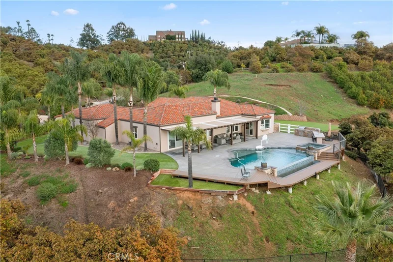 Back on the market at no fault of the seller. Incredible canyon and sunset views set the stage for this luxury De Luz estate pool home, perched at the end of a private cul-de-sac on over 4.55 acres of productive orchard land overlooking the protected Santa Margarita Preserve. This 4-bedroom, 3.5-bath, 3,272 sq ft residence offers the perfect blend of privacy, elegance, and resort-style living, complete with a breathtaking saltwater infinity-edge pool and spa framed by sweeping hillside vistas. A palm-lined paved driveway leads to a charming courtyard and oversized leaded double doors opening to a light-filled, open floor plan designed for entertaining. Interior features include new interior paint, crown molding, smooth hand-textured walls, graded baseboards, ceiling fans, exterior electric window shades, and carpeted bedrooms. Formal living and dining rooms flow into a welcoming family room with fireplace and a gourmet kitchen featuring a six-burner Viking stove, double KitchenAid ovens, quartz countertops, Bosch dishwasher, walk-in pantry, built-in buffet with wine refrigerator, breakfast bar, and eat-in dining area. The primary suite is a private retreat offering a walk-in closet, spa-style bath with dual sinks, vanity, jetted tub, walk-in shower, and a private office located just off the suite. Two guest bedrooms share a Jack-and-Jill bathroom with dual sinks, providing comfort and functionality. Outdoor living is exceptional with a custom deck surrounding the infinity pool and spa, an Alumawood-covered patio, built-in BBQ, two blue bowl fire pits, outdoor refrigerator, and expansive entertaining spaces ideal for enjoying unforgettable sunsets. The property includes over 200 avocado trees and more than 340 tangerine trees, along with fig, lemon, lime, pomegranate, Asian pear, and olive trees. Additional features include RV parking, room for an ADU, custom chicken coop with run, whole-house fan, dedicated laundry room, ample storage, and a charming half bath with custom wine barrel sink. Located just minutes from Old Town Temecula, wine country, golf, dining, and Pechanga Resort & Casino. Unincorporated Riverside County offers lower tax rates and the option for Temecula or Murrieta schools. A rare opportunity to own a true luxury orchard estate with views, privacy, and lifestyle.