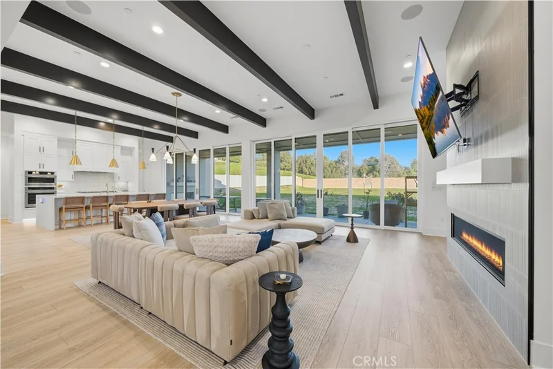 Experience refined single-level living in this nearly new luxury home located in Temecula. Built just one year ago, this exceptional residence offers 6 bedrooms, 5.5 bathrooms, and a thoughtfully designed open floor plan that blends modern style with everyday functionality. A striking contemporary exterior and inviting courtyard entry lead into a bright, expansive interior featuring wide-plank flooring, soaring ceilings, decorative ceiling beams, and abundant natural light throughout. The spacious kitchen serves as the heart of the home with high-end appliances, an oversized island with seating, custom cabinetry, and seamless flow into the dining and great room—ideal for entertaining and comfortable daily living. Large sliding glass doors enhance the indoor-outdoor connection and create an airy, open feel. The primary suite provides a private retreat with a spa-like bathroom offering dual vanities, a soaking tub, walk-in shower, and two generous walk-in closet. Secondary bedrooms are spacious and well-appointed, many with en-suite baths, making the layout ideal for guests or multigenerational living. Additional flex spaces offer versatility for a home office, gym, or media room, while attached garages and ample storage add convenience. Located in a desirable Temecula neighborhood near award-winning schools, shopping, dining, and wine country, this property presents a rare opportunity to own a nearly new, high-end single-story home with exceptional space, style, and comfort. Most furnishings are available outside of escrow on a separate bill of sale.