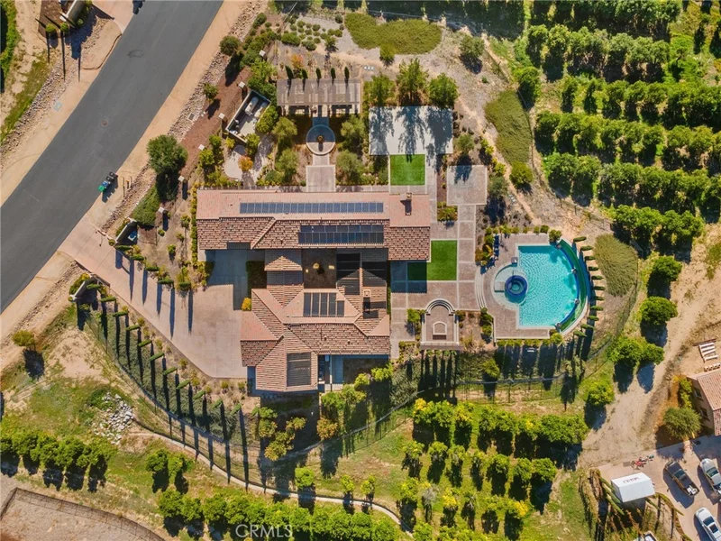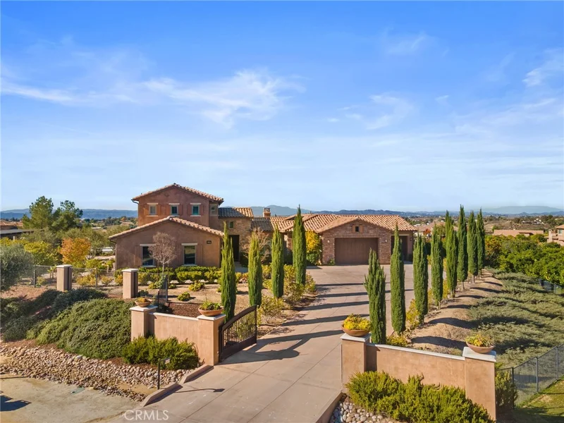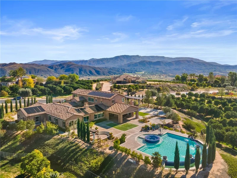 Set behind the prestigious gates of The Groves, this breathtaking 6-bedroom, 6.5-bath Tuscan-style estate embodies the perfect blend of timeless European elegance and modern Wine Country living. Located in the heart of Temecula Wine Country and surrounded by an active, certified organic citrus orchard, the 2.12 acre property offers uninterrupted vistas of rolling groves, vineyards, and glowing sunsets. Olive trees line the streets that lead to the residence, where rich architectural details and refined craftsmanship define every space. Inside, each bedroom enjoys the privacy of its own en suite bathroom, while the primary suite serves as a private retreat complete with a sitting area and a dedicated home gym. The gourmet kitchen features premium Viking appliances, complemented by a wine cellar, formal dining room, and multiple indoor/outdoor living areas ideal for entertaining. An airy atrium brings soft natural light into the home’s core, enhancing its warm, inviting ambiance. Luxury and convenience come standard with paid solar, a whole-home generator, solar pool heater, water softener, reverse-osmosis drinking system, under-counter ice maker, under-counter freezer, custom shutters/blinds, and ceiling fans throughout. The resort-style backyard showcases a sparkling pool and spa, framed by panoramic views of citrus orchards and stunning sunset views. A private casita provides flexible space for guests or multigenerational living. Car enthusiasts will appreciate the expansive 5-car garage, offering ample room for vehicles, storage, or a workshop. Blending Tuscan character with modern sophistication, this exceptional estate captures the essence of luxury Wine Country living within one of Temecula’s most coveted gated communities.