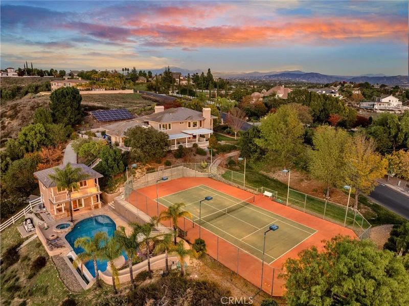 Prestigious Santiago Estates — Temecula’s premier address. Ideally positioned along “Millionaire Row,” this refined estate spans nearly 4 private, usable acres, offering serene views, exceptional privacy, and an elegant residence designed for luxury living. The home showcases 5 spacious bedrooms, including a main-floor primary suite, along with a sophisticated formal living room, formal dining room, and a private executive office. Light-filled interiors, high ceilings, and three wood-burning fireplaces create an atmosphere of warmth and timeless style. The gourmet kitchen features granite countertops, double ovens, stainless steel appliances, and an inviting breakfast nook that opens seamlessly to the estate’s outdoor living spaces. The grounds are nothing short of resort-caliber. Enjoy a lighted tennis court, expansive entertaining patios, and a dramatic infinity-edge pool enhanced by waterfalls, a slide, and a diving platform—an entertainer’s paradise and a true retreat. A beautifully designed guest house provides exceptional versatility with a full kitchen, bathroom, and an upstairs family room with a private balcony—ideal for extended stays, multi-generational living, or a high-end studio. With abundant additional land for horses, vineyards, orchards, or future enhancements, plus paid-for solar, this estate offers both luxury and long-term value. Perfectly located just minutes to town, shopping, dining, and Temecula’s renowned Wine Country—this is an extraordinary offering in one of the valley’s most prestigious and sought-after communities.