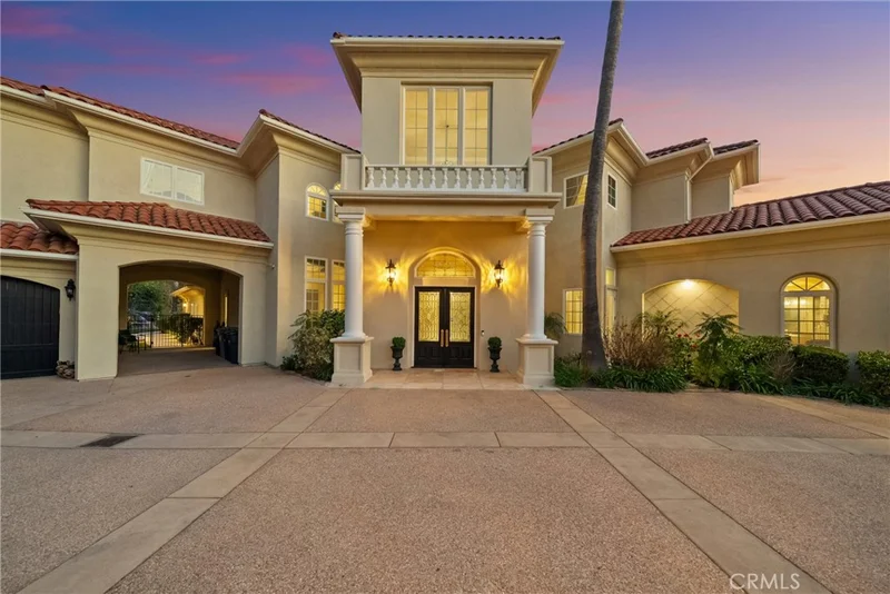 A breathtaking luxury estate in the prestigious gated Renaissance Estates community where timeless architecture converges on five acres and over 7,000 square feet of living space. Masterfully built, this residence has panoramic picturesque views of surrounding hills and valleys, tranquility and privacy. Experience high-end living, impeccably maintained landscapes, and various fruit trees, creating an atmosphere that elevates daily living just minutes from Old Town Temecula. The main residence welcomes you through glass double doors and cathedral ceilings with clerestory windows, illuminating the living room with Temecula’s stunning sunrise. Downstairs unveils a unique theater space and a ready-to-install elevator that makes this home stand out from all the rest. A formal dining room with a fireplace is adjacent to the gourmet kitchen that includes a center island with granite countertops, wine rack, butler's kitchen, high-quality milled wood cabinetry, reverse osmosis water system, and top of the line Bertazzoni six burner stove top with electric griddle. In the right wing, you’ll find the primary spa-like suite, which includes a jetted tub, double vanities, oversized closets, and double doors leading to the sweeping terrace overlooking majestic hills. The left wing offers another commodious guest suite with its own entry doors to the home. As you pass through corinthian marble pillars and walk up the grand staircase, you’ll find five spacious ensuite bedrooms with generous closet spaces, bathrooms, and a bonus room with built-in shelving. Additional home features include thirteen foot ceilings, a laundry chute, and lots of storage space. Entertain with ease when you step into the outdoor living space where you’ll find a spa, pool with its own paid-off solar, and a winding path leading you down to multiple fruit trees and vines. The separate guest house above a two car garage offers multi-generational living and includes a full kitchen, living room, one bedroom, and a full bath. Outdoors you’ll also find an additional car garage, comprehensive security system, and a brand new Generac generator with wifi. This home is a rare opportunity to own a private luxury residence in the heart of De Luz with close access to the 15 freeway.