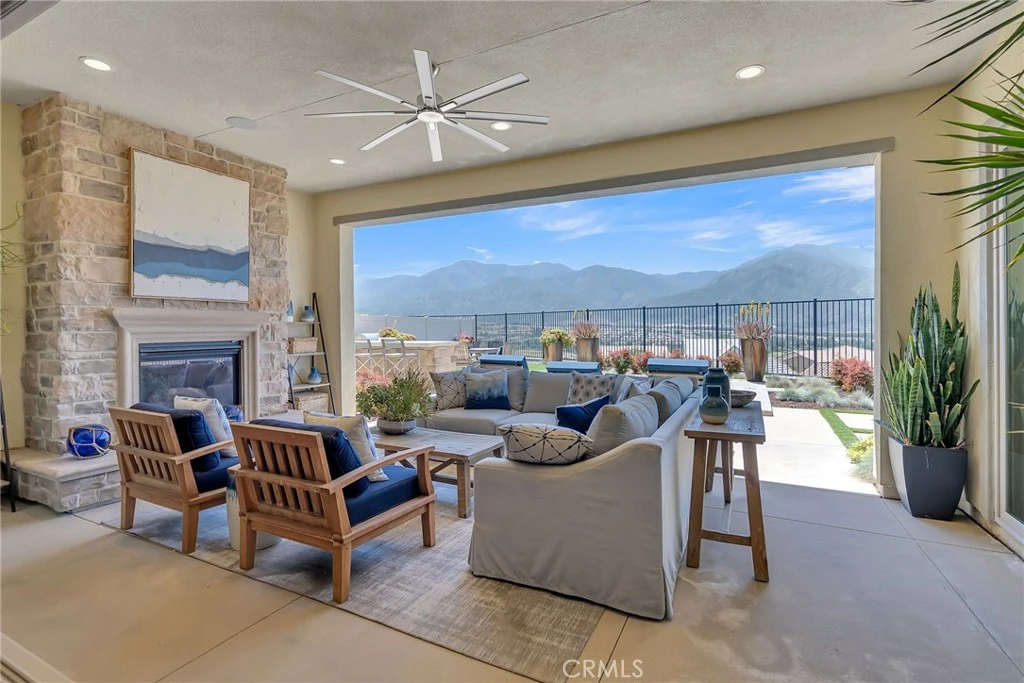 This stunning plan 3 previous model home at Terramor boast truly incredible views of the Cleveland National Forest from the well thought out back yard design with outdoor kitchen ready for entertaining and enticing in ground spa ready to enjoy! Soaring 10’ ceilings are throughout the home with a large 16x18 stacking door to the expansive California room with fireplace, which offers the indoor outdoor living. The home has a 2 car garage plus a golf cart garage. The gourmet kitchen has a large upgraded kitchen island with gorgeous Azul Aran Granite with the perimeter counter top in Bianco Statuario quartz and custom back splash. Upgraded Thermador appliances really put the finishing touch on this custom kitchen. Spacious primary suite has amazing views of the mountains, and the bath is finished in upgraded quartz countertops and a large shower with custom Glass and stone mosaic tile. Open concept office and two more bedrooms with their own baths. Upgraded flooring throughout.