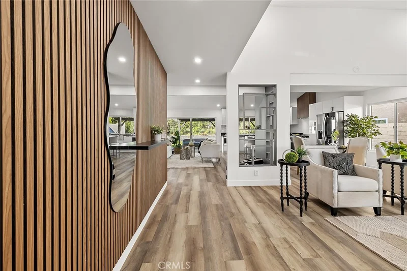 Picture Sunday morning. Coffee in the kitchen you’ve always wanted. Hills out the back window. No neighbors behind you, just open greenbelt and silence. This is what a complete renovation feels like to live in. 205 Cedar Heights is a full transformation of one of Wildwood’s most private single-story homes. Every surface, every system, every finish addressed. Not a paint-and-flip. The real thing. From the street: full-view glass-panel garage door, wood-slat entry detailing, decorative paver accents, refreshed walkway, new landscaping, and a front water feature buyers remember. Every window brand new. Every door, interior and exterior, brand new. Inside, 7.5-inch luxury vinyl plank flooring runs the full length of the home. New recessed lighting throughout. Custom European doors with modern hardware. Updated baseboards and trim. Nothing left untouched. The kitchen is the centerpiece. Euro-style high-gloss cabinetry, quartz countertops on full perimeter and island, full-height tile backsplash, 36-inch farmhouse sink, pendant lighting, and a professional NXR 36-inch range with custom wood-slat hood. LG refrigerator and Samsung dishwasher included. Bar-top pass-through opens to the backyard for real entertaining. Both bathrooms fully remodeled: new vanities, quartz countertops, backlit mirrors, retiled showers with built-in niches, frameless glass enclosures, updated fixtures throughout. Brand new solar-ready electrical panel. Fireplace redesigned with modern finishes. Statement chandelier in main living area. Every bedroom repainted, re-floored, recessed-lit, with European closet doors. The backyard surprises at this price. Five thousand square feet backing to protected greenbelt with no rear neighbors and permanent open space. Newly landscaped, repainted patio cover, added lighting, and bar-top kitchen connection built for outdoor living. Roof freshly painted, new fascia boards. Termite clearance complete. Section one cleared. Third-party inspection passed. Move in Sunday. One block from Cal Lutheran. Ten minutes from Amgen headquarters. Minutes from Wildwood Regional Park, top-rated Conejo Valley schools, The Oaks Mall, and the 101. Homes at this finish level, in this location, backing to greenbelt, do not come back.