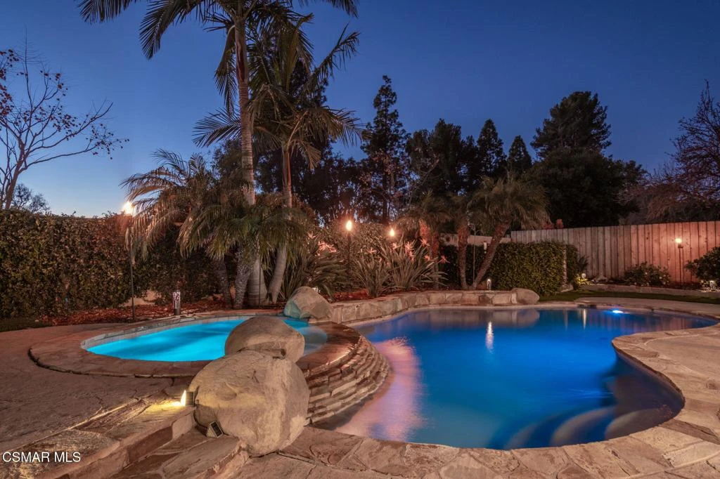 Welcome to effortless California Living in this beautifully upgraded home in the heart of Thousand Oaks. Designed for comfort, style,and modern efficiency. This 3 bedroom, 2-bath residence has it all. This lovely home showcases a stunning kitchen featuring an amazing ILVE Italian range with warming drawer, soft-close cabinetry, silestone countertops, microwave, range hood, and updated appliances. Light Neutral colored wood-like flooring enhance the living area with a cozy fireplace that overlooks the resort-like backyard. The dining room is close to kitchen for easy entertaining.The bathrooms have been tastefully refreshed with new vanities, fixtures, mirrors, and high-efficiency toilets. Fresh interior paint (including ceilings), new baseboards, updated interior doors and frames, dual paned windows.and mirrored closet doors create a cohesive, move-in-ready feel throughout Major improvements provide peace of mind, including a newer roof, fully paid solar with upgraded 200-amp electrical panel, double-pane windows, enhanced attic insulation, LED lighting throughout, ceiling fans in every room, dimmable lighting, Google smart thermostat and doorbell, and a sewer reverse cleanout. Step outside to your private backyard retreat featuring a saltwater pool and spa. Beautiful lighting and drought free landscape too, also an updated heater, pump, salt cell system, and an AquaLink programmable control. Drought-tolerant landscaping, turf, newer fencing, and upgraded irrigation with programmable timer create a low-maintenance, resort-style setting. A spacious side-yard storage shed adds flexibility and function. Beautifully maintained and extensively improved, this move-in-ready Thousand Oaks gem offers comfort, efficiency, and stylish single-level living.The best part is the location with Sapwi Trails community park a few steps away, has 6.7 miles of trails for hiking and biking, a skate and pump track for the littles and an amazing park, disc golf. Beautiful wildlife including an array of birds,a place where neighbors and friends gather. Great schools close by. wonderful shopping, dining and freeway access all you need is close by. I can go on and on about this home, come see for yourself the love and care that was put into this beauty. Ahhhh, Southern California Living!