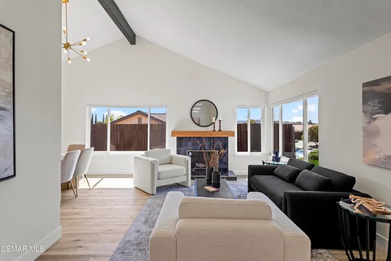 Welcome to this beautifully reimagined single-story home in the heart of Thousand Oaks. Thoughtfully redesigned from top to bottom, this unique gem blends modern style with everyday comfort, offering the feel of a brand-new home. Step inside to the bright living room with vaulted ceilings and a cozy fireplace that flows into the dining area. The family room opens to a modern kitchen featuring a custom wood-detailed peninsula illuminated by accent lighting, quartz countertops, brand-new cabinetry, stainless steel appliances, and serene views of the backyard and distant mountains. Outside, the private, tree-lined yard offers a peaceful escape, perfect for relaxing and enjoying the sound of the breeze through the trees. The spacious primary suite includes sliding glass door to the backyard, generous closets, and ensuite bathroom. All new Milgard dual-pane windows and sliders provide abundant natural light and a seamless indoor-outdoor flow. The garage has been upgraded with epoxy floors, drywall and paint, and new LG front-loading washer and dryer. Additional upgrades include fresh interior and exterior paint, recessed LED lighting, drought-tolerant landscaping with resort-style lighting, a new 200-amp electrical panel, a 40-gallon Bradford White water heater, and a powerful 4-ton Goodman furnace and AC condenser. And so much more! Top-rated CVUSD, close to schools, shopping, and Wildwood hiking. Expertly crafted by One Eleven Designs, this home is a one-of-a-kind treasure just waiting to be discovered!