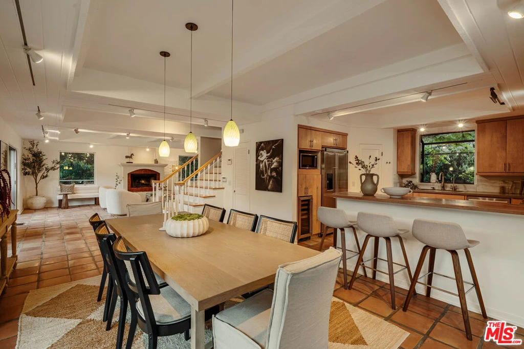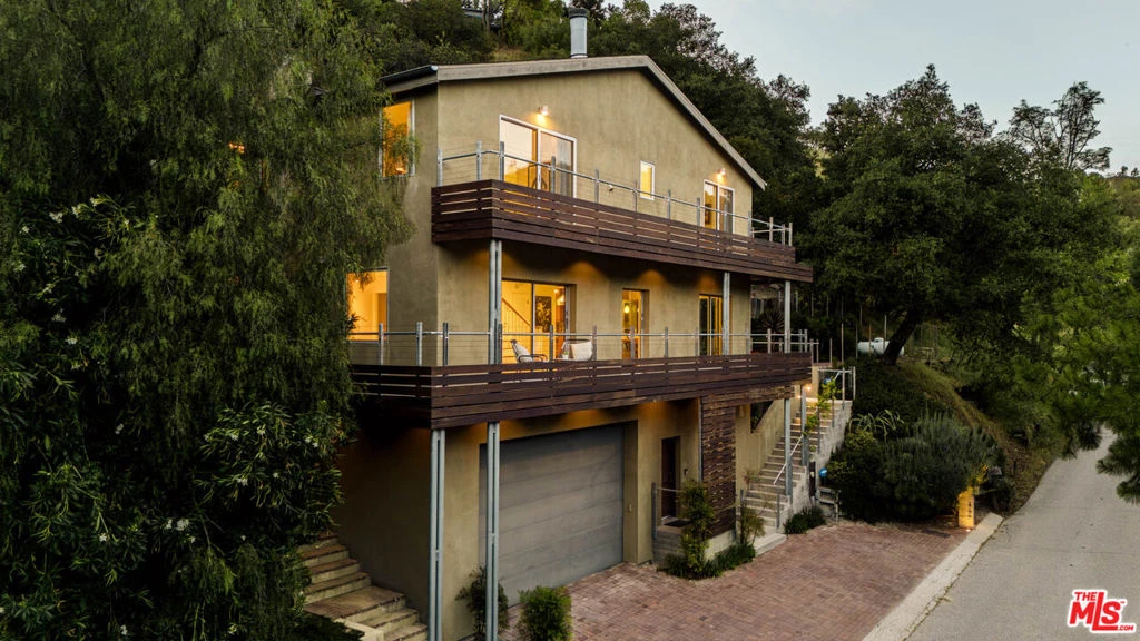 Nestled in one of Topanga Canyon's quieter pockets, this home offers an intimate connection to the surrounding canyon with views of Saddle Peak Ridge, where you can hear frogs in the creek and watch hawks soar overhead. Built by local builder Maurice Bourget and renovated in collaboration with architect John Jennings, the home spans three levels and is designed for easy indoor-outdoor living. The main level features a folding front entry and Fleetwood pocket doors that disappear completely, letting canyon breezes flow through the house and out onto the wrap-around balcony. The living room centers around a wood-burning fireplace, with windows framing the canyon on one side and the backyard hot tub on the other, while the kitchen is well-equipped with a six-burner chef's stove, wine cooler, walk-in pantry, RO and hot water tap. A guest bathroom on this level offers direct access to the backyard. Upstairs, skylights pour light into the hallway leading to three bedrooms. The primary suite looks out over the surrounding canyon with its own fireplace, en-suite bath, walk-in closet, and private balcony, a peaceful place to start and end the day. The second bedroom shares the balcony with the primary and has a charming view of the backyard, and the third bedroom has access to a deck leading out into the yard. Each room finds its own quiet connection to the landscape. The primary has its own en-suite bath, and a shared bathroom serves the second and third bedrooms. The ground level houses a theater room with projector and screen, and a full bath, equally suited as an office or guest suite, alongside an oversized garage with 20-foot ceilings. Outside, native landscaping surrounds a large brick patio with multiple seating areas connected by a walkway that winds through the backyard, with spots to sit, unwind, and take in the natural setting at every turn. The property comes with a 16-panel solar system, fully paid off. Just minutes from Old Topanga Canyon Road and about 15 minutes from Calabasas, this is a well-built, comfortable home in a beautiful part of the canyon, ready to be made your own.