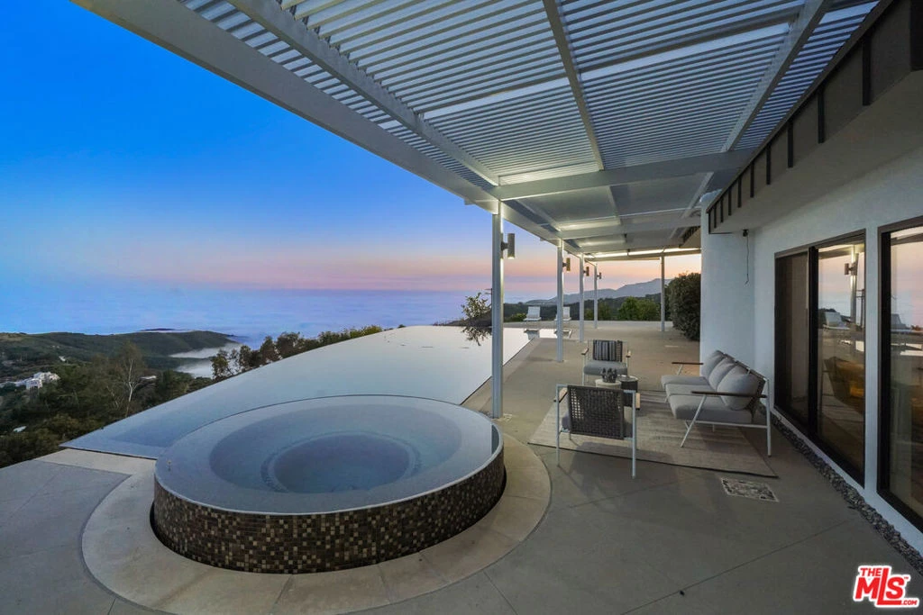 Divine View Mountain Top Pool Oasis. Offer Deadline 06/18/2024, at 6:00 PM.A home provides shelter, and it can also inspire. On the border of Topanga and Malibu, the architectural Devine house, designed by award winning Marshall Lewis AIA, does both. Slip down the long private driveway, past ancient Oaks, to an astonishing abode on nearly 4.5 acres, seemingly one with the rolling coastal mountains. Sweeping 270 degree views take in the sunrise behind snow capped Mt Baldy, flow past the Queen's glittering necklace of the Santa Monica Bay coast, ending in sunsets over the Channel Islands. The wide Pacific is on full display. Pride of home is everywhere evident. The homeowners have been meticulous stewards of this veritable art piece of a home. Strong curved and angled walls open to bright light, open views, and a multitude of steel Fleetwood doors that bring the outside in. Swallows do aerobatics, skimming across the elegantly arched infinity pool. Hawks and Golden Eagles soar past the wraparound patio. The motorized pergola let's you choose; shade or sunlight. The great room's high angled ceiling comes a little closer to earth over the open dining room and chef's kitchen. A huge marble clad peninsula hosts a crowd, high end appliances ease the cooking, and white oak cabinetry has drawers for all the things. A walk-in pantry catches the overflow. A large bedroom on the first floor could work as an office or a den, flanked by a bathroom with a sliding door to a private garden. At the top of the stairs, a large loft is perfect for a gym, a library, or creative space. The curving walls of the owners suite lead to a private view deck where morning coffee or afternoon naps are de rigueur. Stroll between two walk-in closets to the bright, spacious, spa of a bath, with wrap-around vanities, walls of mirrors above, a glass walled shower and a sleek pedestal tub, both framed by stunning views. Two other bedroom suites round out this level, one with vast views of the ocean and hills, the other with a curved castle type wall, punctuated with windows. The finished 3-car garage comes with an electric vehicle charging station, and a spacious laundry area. Step down past the citrus grove to a bright, modern, two room cabin which is perfect for a home office, gym or art studio. You are minutes from Malibu or the Topanga village. Epic trails are nearby. The land is a resource that gives and gives. There are large swaths of flat, open space. Oak groves shade spots for quiet contemplation. There is parking for 15-20 cars, so you can host all the lovely get-togethers that bring people together. Expand the orchard, add a veggie garden, bring the chickens home to roost, add horse facilities. The possibilities are as endless as the views.