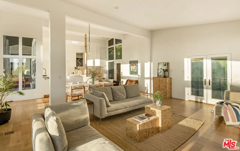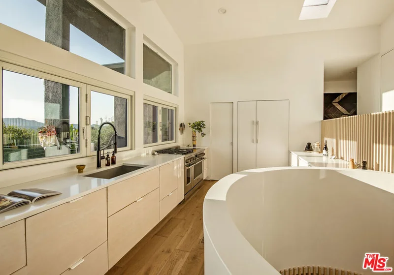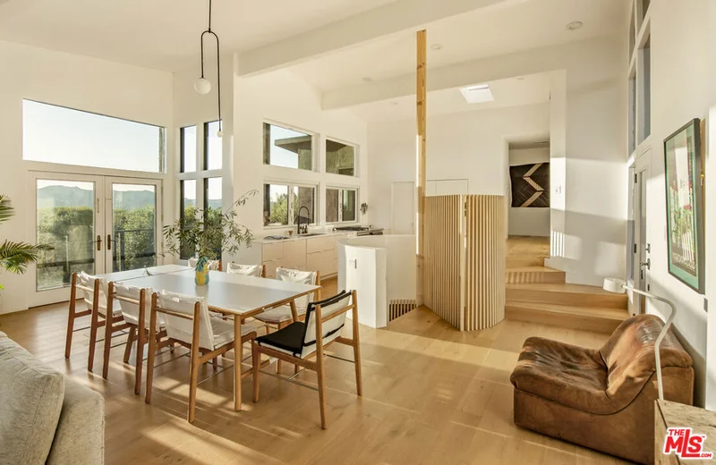 Cereza is an architecturally distinctive Topanga retreat and a true creative sanctuary. Blending rustic nature and design minimalism, the home is filled with shifting natural light from morning through dusk, creating a warm, organic atmosphere throughout. Offering breathtaking, unobstructed views, this pristine 4-bedroom, 3-bath residence is a rare opportunity to live on the coveted ridgeline that merges Topanga's creative spirit with the modern luxury of Calabasas. A sculptural staircase anchors the home, serving as a striking architectural moment that defines the space. The upper level features a chef's kitchen with outdoor counter seating that opens seamlessly to an airy living room and dual panoramic balconies. A private one-bedroom suite on this level includes a retro fireplace and sweeping views that make sunrise and sunset their own unique ritual. Downstairs, a second suite and two additional bedrooms connect directly to an expansive deck surrounded by lush landscaping and a tranquil Japanese soaking tub. Multiple outdoor lounge areas are positioned to take full advantage of the canyon setting ideal for entertaining, reflecting, or simply being present in nature. A detached cabin studio provides additional privacy and flexibility, complete with a built-in work area and loft bed for a guest. A dedicated yoga platform and suspension net allow you to float amongst the oaks, creating calm and connection with nature. Completing the property, a two-car garage currently serving as a ceramic studio and Hi-Fi movie lounge with adjoining gym adds versatility to this thoughtfully designed residence. Where design, nature, and intention converge. Welcome to Cereza.