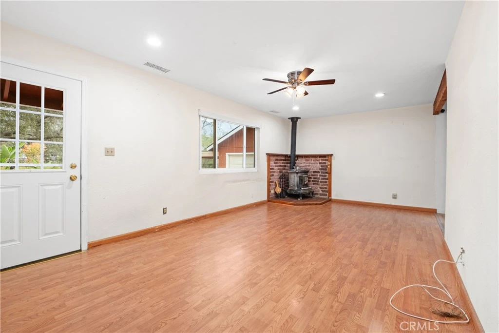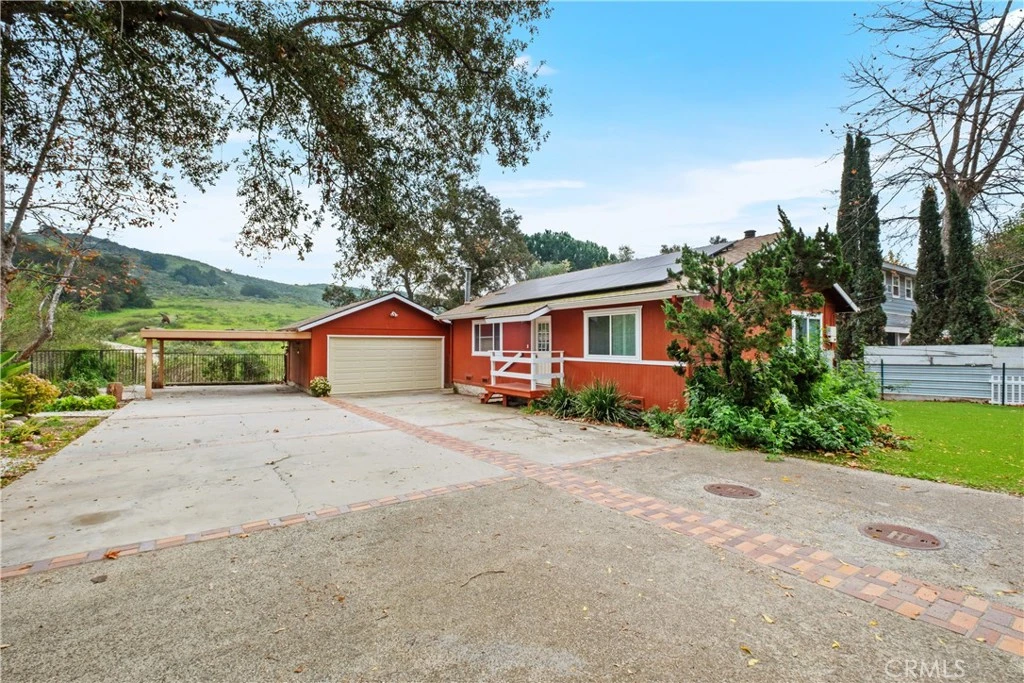 Tucked away in the heart of Trabuco Canyon this 2-bedroom and 1-bath home sits on an expansive four-lot property, offering a rare opportunity to enjoy space, privacy, and true canyon living. Upon entry, you are welcomed into a cozy living room featuring a wood-burning fireplace, creating a warm and inviting atmosphere. The eat-in kitchen includes appliances and provides ample storage throughout. Just off the kitchen, a deck offers the perfect place to relax and enjoy views of the backyard and surrounding scenic canyon landscape. The home offers two spacious bedrooms, each with mirrored closet doors. Amenities include a 2-car garage, covered carport, central heating and air, solar, turf landscaping, and a gated driveway. Surrounded by mature trees, open skies, and peaceful hillside views, the generous land offers the possibility for horses, a barn, a corral, or gardens. Located near restaurants, general store, O'neill Regional Park and miles of hiking, biking, and equestrian trails, this property offers a serene connection to nature and the unique charm of canyon living.
