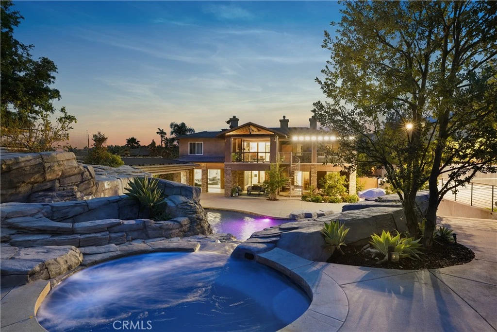Tucked within Santiago Canyon Estates, this private resort-style home is designed around outdoor living, recreation, and entertaining, featuring expansive grounds with a rock pool, water slide, spa, and natural rock jumping ledge into a 10-foot deep pool, creating a private backyard retreat. Outdoor living areas include a fire feature integrated into the pool, a covered patio with built-in fireplace and heaters, and an upper seating area capturing canyon and hillside views, along with multiple seating and dining areas throughout the yard, plus a putting green, in-ground trampoline, and a sports court that can also be used for pickleball. The outdoor kitchen, built in 2019, includes a built-in BBQ, smoker, pizza oven, ice maker, microwave, soft-close cabinetry, heaters, sunshade and windscreen, full-size refrigerator, and refrigerator drawers, forming a fully equipped outdoor kitchen and entertaining space, while the backyard also includes two outdoor bathrooms, an outdoor shower, and 16 fruit trees throughout the property. The home opens to an interior featuring handcrafted hardwood flooring, custom crown molding with integrated recessed lighting, plantation shutters, built-ins, and multiple living and bonus rooms. The layout includes elevator access to the second level, a main floor bedroom and bathroom, and a separate staircase leading to a second wing, providing flexible space for guests, office space, or multi-generational living. The large family room is anchored by a massive fireplace and opens directly to the outdoor kitchen and covered entertaining areas with tile flooring that seamlessly transitions from the interior to the covered outdoor space, creating true indoor-outdoor living. A spacious dining area sits between the kitchen and family room, ideal for entertaining, and the kitchen features Taj Mahal quartzite countertops, two-tone cabinetry, a large center island, walk-in pantry, refrigerator drawers, full-size refrigerator, and two microwaves. Additional features include paid solar, whole house generator, EV charging, new windows and doors, water purification system, luxury HVAC, three tankless water heaters, upstairs and downstairs laundry rooms, and RV storage on site, creating a home designed for private resort-style living in Santiago Canyon Estates near hiking trails, outdoor recreation, and Orange County shopping, dining, and coastal destinations.