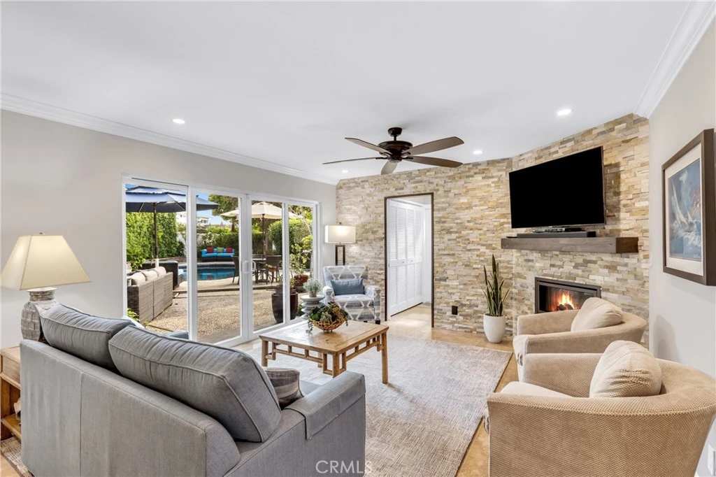 Resort-style living on a rare pie-shaped lot in a prime Tustin location, this beautifully upgraded home offers a thoughtfully designed interior and exceptional indoor-outdoor living. As you enter the home, you are welcomed into a spacious formal dining room featuring a custom fireplace and a large wine refrigerator, creating a warm and inviting setting for gatherings. The layout flows seamlessly into the fully remodeled kitchen. The updated kitchen is the heart of the home, featuring quartz countertops, a huge center island with a gorgeous granite top, soft-close cabinetry, double ovens, a Dacor 6-burner range, and a walk-in pantry, perfect for both everyday living and entertaining. A sunny breakfast nook sits just off the kitchen and opens to the spacious family/living room, creating a true great room feel, complete with a second fireplace and abundant natural light. The spacious primary suite is conveniently located on the main level, offering a private retreat with a beautifully updated bath with dual sinks. Upstairs offers three additional bedrooms and a full bath with dual sinks, providing flexibility for family, guests, or a home office. Step outside to an incredible, resort-style backyard designed for both relaxation and entertaining. Set on a rare pie-shaped lot, this private outdoor space features a large swimming pool, expansive grassy area, and multiple seating areas creating the perfect setting for gatherings or quiet evenings at home. Extensive upgrades throughout the home include travertine flooring, crown molding, plantation shutters, recessed lighting, new windows, ceiling fans, soft-close cabinetry, an inside laundry area conveniently tucked behind doors, a LifeSource Water System, and PEX piping. Energy efficiency is enhanced with solar, helping to keep utility costs down. Ideally located close to schools, shopping, and convenient commuting options, this home offers the best of comfort, style, and location.