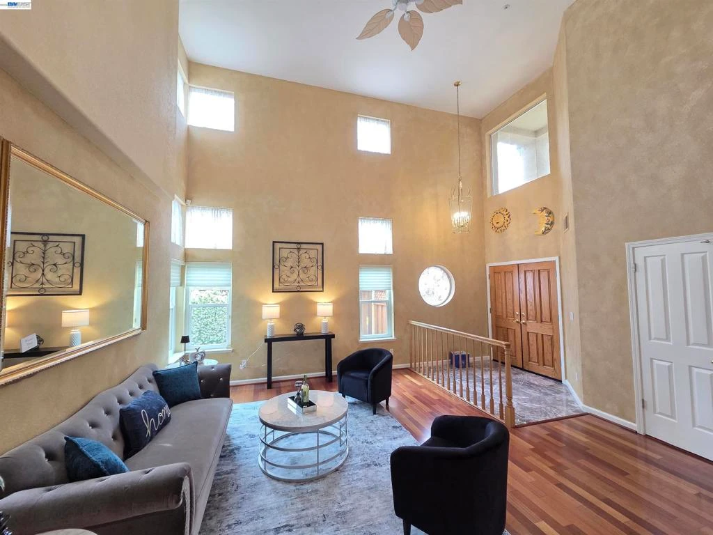 A truly impressive home located in Union City’s premier gated community of Meridien Court. As you enter this home you’ll be amazed with the 18-foot high ceilings in the large living room & formal dining room which also offer Brazilian Cherry hardwood floors and marble-like columns. The kitchen features granite counters, plenty of cabinets & stainless-steel appliances; including: Bosch dishwasher & new gas cook-top. A separate family room offers a cozy fireplace. Downstairs also includes a bedroom & a full bathroom. Upstairs: A large master suite includes a romantic 2-sided fireplace, a spacious bathroom with a walk-in closet, and large shower. The two other bedrooms are also spacious & bright. You will also enjoy the bonus room for either a 5th bedroom, playroom or study area. You will like the A/C during the hot summer months. Most windows have been upgraded to "Argon Gas filled" windows for superior insulation to keep your PGE bills lower. Enjoy the covered patio in the low-maintenance backyard with no rear neighbors. This premier community includes gated access with a gate attendant, large resort-like swimming pool area, basketball court, park & playground. This neighborhood is safe for kids to play outside and adults can take quite walks outside. Conveniently located with easy access to I-880, 84, and 92. Walk, ride or drive to nearby Union Landing: Shopping, Starbucks, restaurants, movie theater and so much more. Biking and walking trails are nearby. Come see why this is the best floor plan at Meridien Court. Priced $100k below comps. Nearby RR tracks are only for a cement factory near Home Depot and train drive at 10 mph & don't blow the horn. They come during hours of 10am-5pm. OPEN HOUSE: Sat 5/2 & Sun 5/3 Don't miss it.