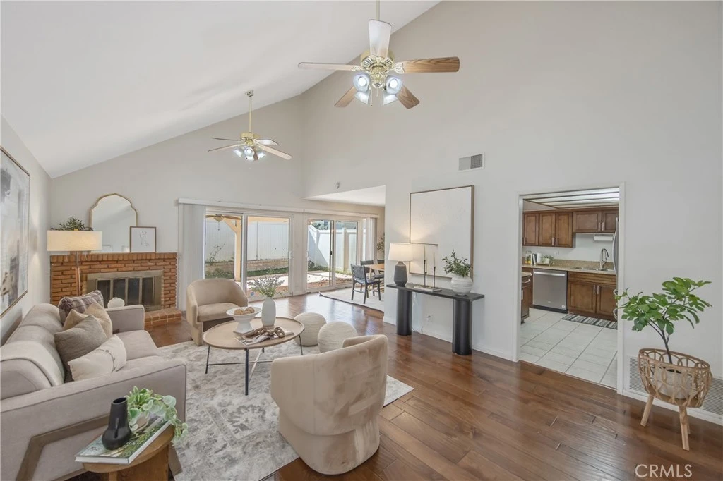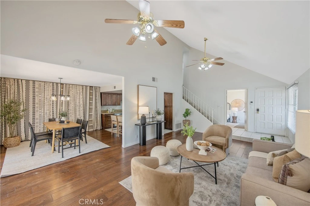 Fantastic 4 bedroom Valencia residence on a beautiful street in the Valencia Racquet Club! This beautiful home is light and bright, offering a fabulous floor plan with 4 large bedrooms, 2 baths and spacious living space! The upgraded kitchen features recessed lighting, classic dark cabinetry, sit up bar and plenty of counter space! The kitchen conveniently opens to the dining room and spacious family room! The spacious downstairs bed and bath can double as another primary bedroom or additional living space with double wardrobe doors and en suite bath. Upstairs you will find 3 spacious bedrooms and 2 full baths. The home also features a newer A/C unit! The yard is wonderful for entertaining and plenty of space for pets and children to play! This is a home to be enjoyed for years to come! Walking distance to community park, sports courts, pools, elementary and junior high schools! Low HOA and NO Mello Roos!!