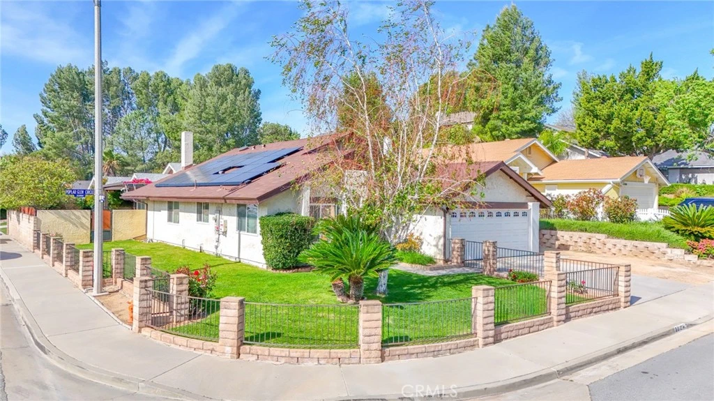 Nestle in the desirable Valencia community, this well-maintained single-family residence offers 3 bedrooms 3 baths, and appoximately 2,083 square w feet with of throughtfully designed living space. A gated front entry welcome you with manicures landscaping, creating an inviting first impresion. Inside, the home opens to a bright and spacious living area featuring clean tile flooring at the entrance, and warm laminate floors throughout the main living space, enhanced by abundant natural light. The Kitchen is positioned to the left of the home and offers generous functionality with ample cedar cabinetry, quarts countertops, a stainless-steel-faucet, and dedicated space for dinning. Additional features include a breakfast bar and a built-in wine refrigerator, making it ideal for both everyday living and entertaining. The right wing of the home has been fully remodeled and includes a comfortable family room, three bedrooms with walking in closet, and a dedicated office space. One bathroom is conveniently designed with dual access between two bedrooms, while the primary suite offers privacy with is own bath, featured with dual sinks, a separate enclosed shower and toilet area, and an expansive walk-in- closet. The primary bedroom also showcases a custom ceiling design and upgraded lighting. The back yard is designed for relaxation and entertainment, accessible through sliding glass doors. Enjoy a fully equipped outdoor space complete with a built-in barbecue, patio furnishings, a swimming pool with waterfall features, and retractable awing controlled via mobile divice. The surrounding greenbelt enhances privacy and provide a tranquil setting. Additional features include integrated cable wiring and smart home capabilitieexa enables control. This is a true turnkey property, ready for immediate occupancy.