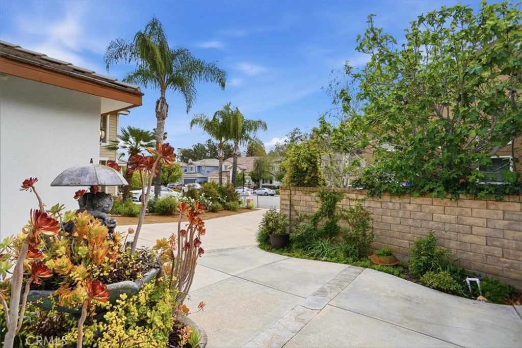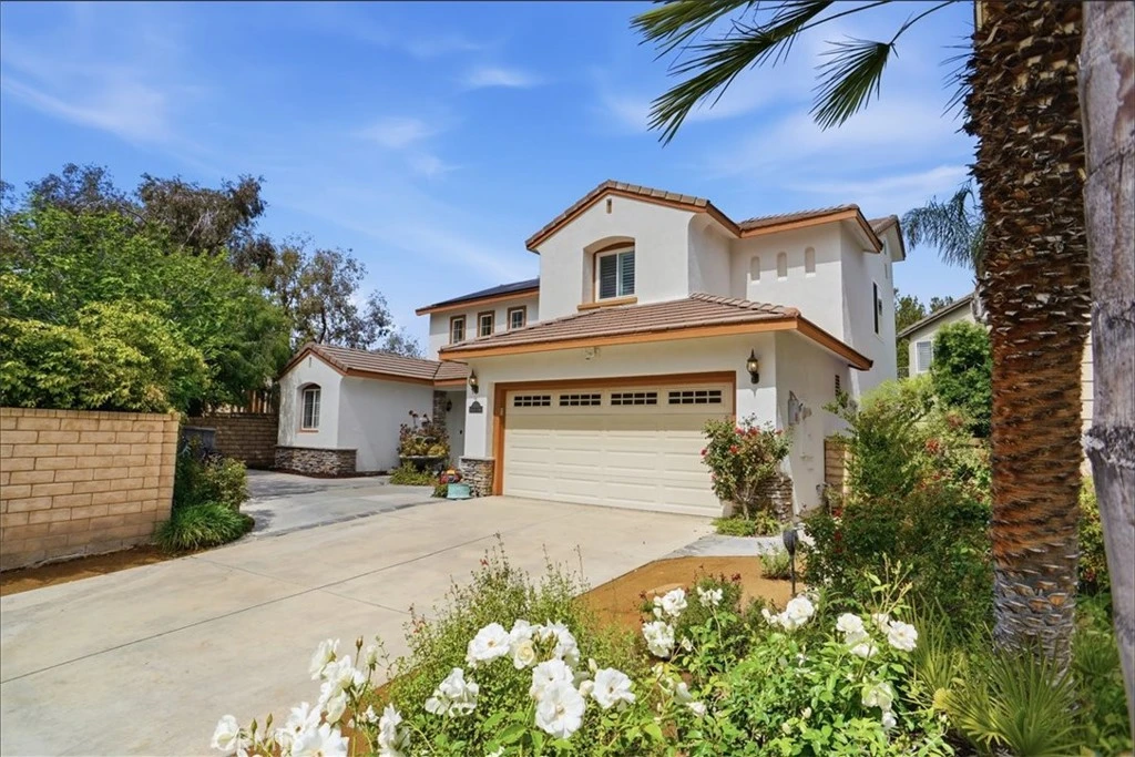 Desirable Valencia Northbridge “Montage” home located at the end of a cul-de-sac, offering privacy, minimal traffic, and an expansive pie-shaped lot with treetop sunset views. This spacious residence features 4 bedrooms plus a separate downstairs game/activity room, 3 bathrooms, and approximately 3,037 square feet of living space. A highly functional floorplan includes a downstairs bedroom with walk-in closet and adjacent full bath; ideal for guests or multi-generational living. The home offers both formal living and dining areas, along with a generous family room that opens to a spacious kitchen featuring a center island, double ovens, large pantry, abundant cabinetry, and a bright breakfast area overlooking the rear yard. Upstairs, you'll find two secondary bedrooms—each with walk-in closets—a full hall bath with dual sinks, and a versatile landing area with built-in work/study station and extensive storage, including a convenient laundry chute to the downstairs laundry room. The expansive upstairs primary suite offers a private balcony with treetop and horizon views, a separate retreat area (perfect for nursery, office, or sitting space), and a well-appointed bath with luxurious tub, separate shower, dual sinks, makeup vanity, walk-in closet, and private water closet. Interior highlights include wood flooring, plantation shutters throughout, natural gas fireplace, and a downstairs laundry room. The oversized lot provides a covered patio, grassy area, garden spaces, and a large side yard including an elevated playhouse. Additional features include an extended driveway for added parking and activities, owned solar system, and access to community pool and play areas. Convenient access to the Valencia Paseo and Santa Clarita trail system connecting parks, schools, shopping, and dining. No Mello Roos Taxes. Low HOA dues.