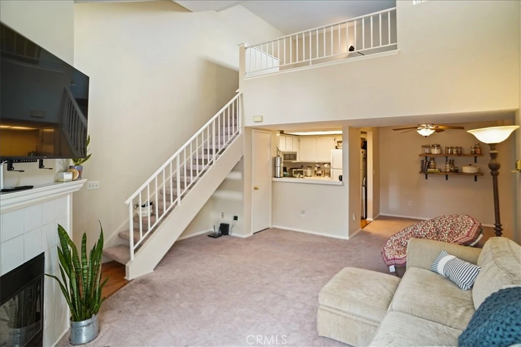Beautiful One Bedroom and One Bath Plus Loft in Siena Villas Located in Valencia that is FHA and VA Approved. Welcome to this desirable upstairs unit in the sought-after Siena Villas community. This light-filled condo features soaring high ceilings and a spacious open-concept living room with a charming tiled fireplace and custom paint throughout. Enjoy abundant natural light and access to a private balcony, perfect for relaxing or entertaining. The home offers a separate dining area and a well-appointed kitchen that opens to the living room, complete with white tiled countertops, white cabinetry, and stainless steel appliances. The large primary bedroom includes access to a private patio, an attached bathroom with vanity, a shower/tub combination, and a walk-in closet with custom organizers. Upstairs, the expansive loft features its own closet with custom organizers and can easily be used as a second bedroom, home office, workout area, or playroom. Additional highlights include underground parking and access to community amenities such as a pool and spa. Conveniently located near the Valencia Mall, Award winning schools and Summit walking trails, farmers market, shopping, schools, and easy freeway access. (water and trash covered by HOA)
