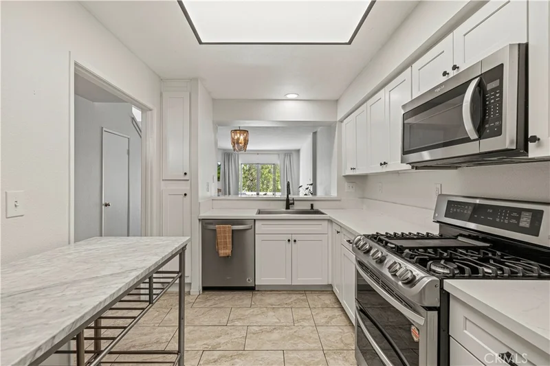 Welcome to this beautiful Franciscan Hill townhome, which offers 2 spacious bedrooms, 2.5 baths, and over 1,200 sq ft of inviting living space in the heart of Valencia, CA. As you enter, you'll appreciate the easy layout with direct garage access, a newer water heater, a stylishly updated kitchen featuring stainless steel appliances, a newer range stove, white cabinets, quartz countertops, a cozy breakfast bar, tile floors, and a convenient pass-through to the dining area. The step-down living room features warm wood laminate floors, a charming corner fireplace, a private balcony with stunning views, and additional storage space. Upstairs, you'll find two generously sized en-suite bedrooms, each with walk-in closets, wood flooring, and one with a fireplace. The natural light pours in through the skylight, and the upstairs laundry closet includes a stacked washer and dryer for your convenience. Enjoy guest parking and a community pool and spa steps away. You're also just minutes from CalArts, College of the Canyons, Valencia Town Center, great restaurants, and the 5 freeway. This is the perfect blend of comfort, location, and lifestyle! NO MELLO ROOS!