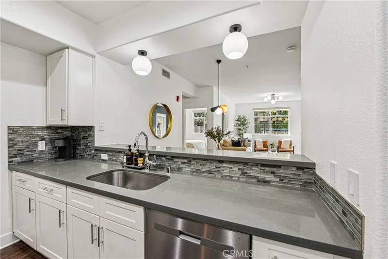 Welcome to this beautifully maintained fully furnished 2-bedroom, 2-bath condo in the highly desirable Madison at Town Center community—just steps from Westfield Valencia Mall. All furniture is included in the sale, making this a truly turnkey opportunity. This stylish first-floor residence offers exceptional convenience with no stairs or elevators and easy access to community amenities. The bright, open-concept layout features a modern kitchen with stainless steel appliances, sleek countertops, and ample cabinetry, ideal for everyday living and entertaining. Luxury plank flooring runs throughout the unit, complemented by new light fixtures and new windows that fill the home with natural light. A built-in desk in the living area provides a perfect home office or study space. The spacious primary suite offers a walk-in closet and a spa-inspired en-suite bath with dual sinks and generous storage. The secondary bedroom includes its own full bath, walk-in closet, and direct access to the private patio—ideal for guests or shared living. A large laundry closet with side-by-side washer and dryer adds everyday convenience. Enjoy the private patio, accessible from both the living room and bedroom—perfect for morning coffee or evening relaxation. Additional features include a newer HVAC system, two reserved parking spaces, and secure gated access. Residents enjoy resort-style amenities including a pool and spa, fitness center, private movie theater, clubhouse, billiards room, outdoor fireplace, BBQ areas, Amazon lockers, and beautifully landscaped paseos. Set in a vibrant, walkable neighborhood close to shopping, dining, nightlife, and bike paths, this turnkey condo offers exceptional value and lifestyle.