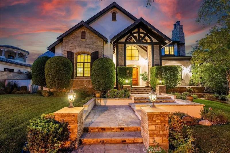 Among the rare custom Westridge Estates perched along the 18th green of The Oaks golf club, a PGA Tour designed golf course, with spectacular views of the entire Santa Clarita Valley! One of the larger lots overlooking the course with an entertainers yard featuring a beautiful pool, spa and plenty of room for play or just watching the amazing view, all with the security of a 24-hour guard gated community. Designed with both function and sophistication in mind, the open floor plan features a grand entrance with breathtakingly high ceilings and a handmade calligraphy staircase. Spacious primary suite on the main level with vaulted ceilings and a retreat with a fireplace. An additional en-suite bedroom down, ideal for guests or multi-generational living. The spacious kitchen has an unusually large island, custom soft close cabinetry, high-end appliances, and a large walk-in pantry with venting and electrical for dining prep. The kitchen opens to the living room providing the perfect space for those looking to host friends, family, & loved ones. Located upstairs are three oversized en-suite bedrooms, each with their own walk-in closets. Enjoy the remarkable view with your morning coffee or evening wine on the covered deck of the third floor. A finished basement serves as the ultimate game or movie room, and an elevator that seamlessly connects all three levels. The interior was thoughtfully selected with high-end finishes throughout including fresh paint, a spacious laundry room, and a dedicated multi-purpose room. Custom ¾ inch thick hickory flooring in the kitchen, dining room, and upstairs hallways too. The massive subterranean 10-car garage that's approximately 3,300 sq. ft. — a collector’s dream! A true backyard oasis — complete with a sparkling pebble tech pool & spa, waterfall, waterslide, built-in BBQ with seating, expansive grassy areas, and generous side yards for recreation. Very few custom estates can combine resort-style living with peace of mind like Oak Meadow does. Truly a one-of-a-kind offering that redefines luxury in Valencia.