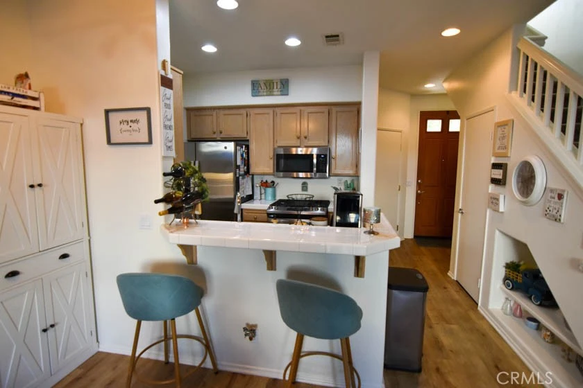 Fantastic, beautifully updated 2-bed, 2-bath, 1,025 sq ft townhome located in the highly desirable Cheyenne neighborhood in Valencia. Featuring recently updated wood laminate flooring and fresh interior paint. A front courtyard welcomes you to the front door and formal entry, leading into an open-concept living space with abundant natural light. The kitchen features recessed lighting, white tile countertops, ample cabinetry, and a convenient breakfast bar. The living and dining areas feature a cozy brick fireplace, built-in shelving, and sliding glass doors to the backyard. Upstairs, you’ll find the primary bedroom with a ¾ en-suite bathroom. An additional spacious bedroom has access to a full bath in the hallway. The private backyard is currently designed for low maintenance and water efficiency, with patio space. The 1-car attached garage provides direct access and includes a dedicated laundry area. Ideally located near shopping, dining, entertainment, recreation, and schools. Community amenities include a well-maintained complex with a pool, spa, and recreational areas. Don’t miss this opportunity!