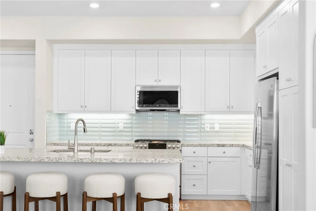 Rarely available and move-in ready, this former model corner residence in Valencia’s sought-after Five Point community offers EV Charging and Solar. Ideally positioned in a private end location, this light-filled home features an open-concept layout that seamlessly connects the main living area to a set-back balcony giving you a more private and quieter feeling. Thoughtfully upgraded with designer finishes, the interior showcases custom paint with accent detailing, stylish lighting, plantation shutters with split-tilt functionality, plush new carpeting with premium padding, LVP flooring, and sleek cabinetry with soft-close features. The spacious layout lives larger than many three-bedroom homes, offering oversized closets and abundant storage. As a former model, the home includes smart-home technology, a private tandem garage with EV charger, custom garage shelving, whole-home water filtration system, and additional nearby private storage. Located within Valencia by Five Points’ eco-conscious community designed for net-zero greenhouse gas emissions, residents enjoy EV-friendly infrastructure, community gardens, and expansive green spaces, weekly farmers markets, resort-style pools with cabanas, gas barbecues, children’s play areas, multiple parks, scenic walking and golf cart trails, and breathtaking mountain views throughout the community—all with more favorable HOA dues than many newer communities. Just minutes from the 5 Freeway, Highway 126, Six Flags Magic Mountain, and all that Valencia has to offer. This home is a must see!!!