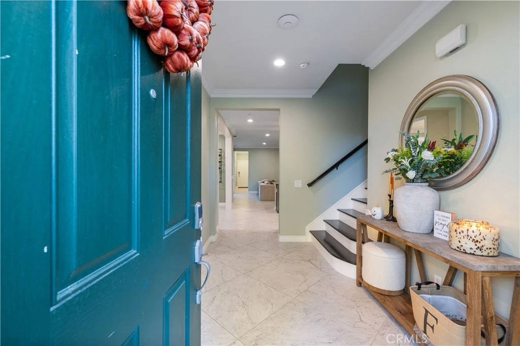 Welcome to your dream home in the highly sought-after West Creek community! This luxurious 4-bedroom, 3.5-bath home offers 2,887 sq. ft. of beautifully designed living space where not a single detail was spared. The open-concept layout features a spacious family room with a marble-faced linear fireplace, a gourmet kitchen with granite countertops, custom backsplash, an oversized island, plus a formal living room and dining area filled with natural light. Downstairs includes a full bedroom and bathroom—perfect for guests—while upstairs offers a large bonus area/loft, three additional bedrooms, and two full bathrooms with dual vanities. The elegant primary suite includes wood ceiling accents, a custom barn door, dual walk-in closets, a soaking tub, walk-in shower, and dual vanities. Additional highlights include modern tile flooring, plantation shutters, crown molding, stainless steel appliances, custom lighting, a tankless water heater, and a paid-for solar system. The laundry area is over sized and includes additional storage area. The exterior is picture-perfect, with meticulously maintained landscaping and excellent curb appeal. The backyard creates a relaxing retreat with a covered patio, recessed lighting, ceiling fan, pavers, and even a lime tree—ideal for morning coffee or evening wine under the stars. 3 total parking spaces, 2 garage and one uncovered next to the garage with an EV charger. Located near top-rated schools, parks, pools, and shopping, this stunning home truly exudes pride of ownership.