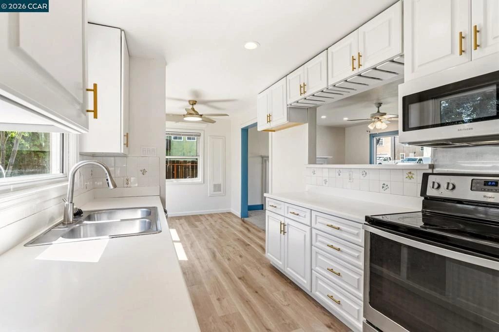 Charming, updated home with character, natural light, and inviting outdoor space. This thoughtfully refreshed property blends classic appeal with tasteful modern finishes. The bright, functional layout features an updated kitchen with white cabinetry, sleek hardware, and ample counter space, opening to comfortable living and dining areas filled with natural light. The living room is anchored by a fireplace and large window, creating a warm gathering space. The remodeled bathroom offers a custom vanity, marble surfaces, and designer fixtures with a timeless feel. Bedrooms are light-filled and comfortable, complemented by hardwood flooring that adds warmth and character. A spacious rear deck extends the living space outdoors—ideal for entertaining or relaxing—while the yard provides privacy and flexibility for gardening or play. Additional improvements include updated lighting, dual-pane windows, and a practical layout designed for everyday living. Conveniently located near local amenities, commuter routes, and the Vallejo waterfront.