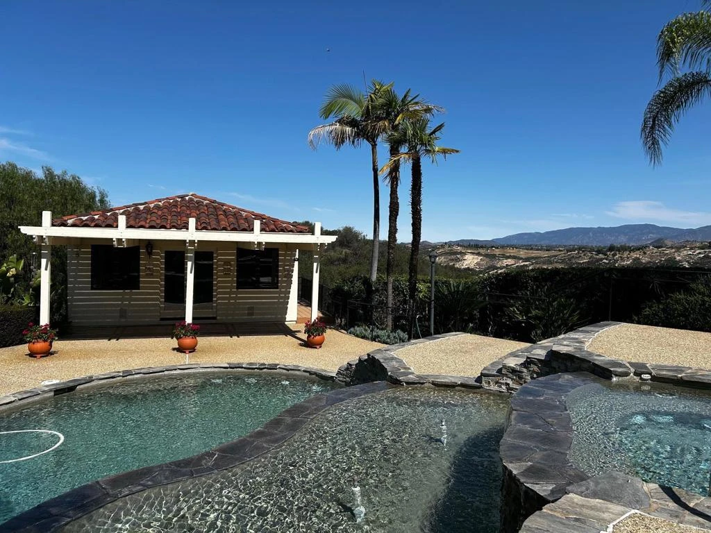 Incredible opportunity to own a magnificent custom home in the highly coveted Ridge Ranch gated community. Enjoy exceptional privacy, breathtaking views, and exquisite craftsmanship throughout. A welcoming front-entry courtyard sets the tone for this impressive residence, featuring expansive rooms, wood-trimmed window casings, and a vaulted living room with exposed wood beams. The family room showcases a stunning rock-faced fireplace, perfect for gathering and relaxing. Step outside to enjoy open space and scenic walking paths, along with a resort-style backyard designed for both entertaining and tranquility. The pool house includes a convenient kitchenette and bathroom, complementing the beautifully designed three-tiered saltwater PebbleTec pool with spa and fountain features. Additional highlights include a circular driveway, back-up generator for added peace of mind, large shed, and tree house. You'll enjoy roaming around the property experiencing peaceful views and serene surroundings. You must see the home to fully appreciate the quality and amenities of this property.
