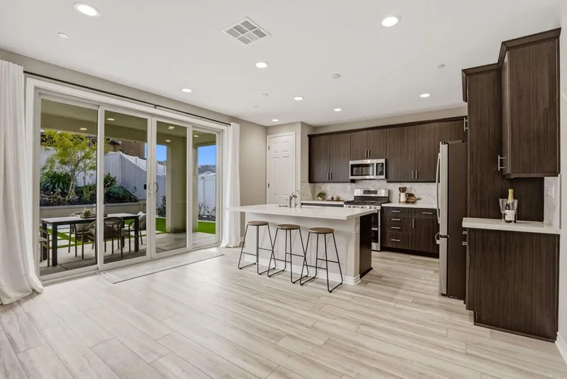 Welcome to luxury living in Valley Center’s sought-after Park Circle community. Built in 2022 by Richmond Homes and still under builder warranty, this north-facing 4-bedroom, 3-bath home offers 2,665 sqft of thoughtfully upgraded living on a premium lot, complete with fully paid solar for long-term energy savings and value. Model level finishes elevate the interior, including luxury vinyl plank flooring, upgraded baseboards, recessed lighting, and abundant natural light throughout. A full bedroom and bath on the main level provide ideal flexibility for guests or a private office. The chef’s kitchen is beautifully appointed with quartz countertops, upgraded cabinetry, tiled backsplash, double ovens, 5-burner gas range, oversized refrigerator, and reverse osmosis water system. Upstairs, a spacious loft wired for media offers versatility as a secondary living space or potential 5th bedroom. The professionally landscaped backyard features a covered patio, fruit trees, and raised garden beds, creating a seamless indoor-outdoor living experience. Located within Park Circle, residents enjoy resort-style pools, fitness center, walking trails, sports courts, dog parks, and vibrant community events.
