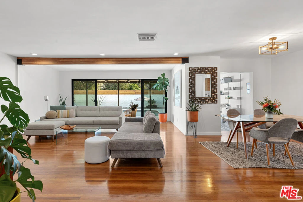 Welcome to this beautifully appointed and tastefully updated Valley Village gem that effortlessly blends classic mid-century charm with modern sophistication. Perfectly nestled on a quiet cul-de-sac, this single-story retreat offers the rare combination of neighborhood tranquility and easy access to the very best of Los Angeles living. The thoughtfully designed floor plan features four bedrooms, including one that has been converted into a sleek, private home office. Two and a half well-appointed bathrooms, including a conveniently located powder room, round out the interior with both style and practicality. Original hardwood floors, exposed beams, and mid-century character combine seamlessly to create a timeless elegance throughout the home. The sun-filled family and dining rooms open naturally into a beautifully renovated kitchen equipped with state-of-the-art appliances and elegant custom cabinetry. The backyard was thoughtfully designed to host guests or enjoy private relaxation as the sparkling pool takes center stage, surrounded by a generous covered patio that offers shade, style, and plenty of room to lounge.