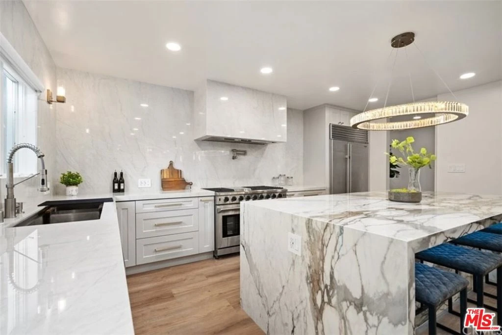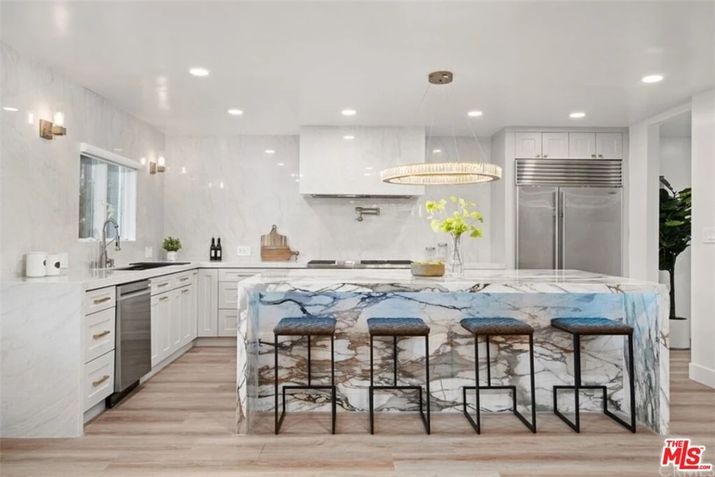 Situated in a quiet, tree-lined pocket of Valley Village, this exceptional contemporary residence offers nearly 5,000 square feet of thoughtfully designed living space on a generous 9,450 square foot lot. The home features seven bedrooms and six bathrooms, including two spacious primary suites, providing flexibility and privacy for comfortable living. Soaring ceilings and a bright open floor plan create a striking first impression, complemented by custom LED fireplaces and expansive living and family spaces ideal for both everyday living and entertaining. The chef's kitchen is the centerpiece of the home, showcasing a porcelain waterfall island, custom cabinetry, designer porcelain countertops and backsplash, and high-end appliances.The primary suite offers a private balcony overlooking the backyard, dual walk-in closets, and a spa-inspired bathroom with dual vanities, a soaking tub, and a large glass shower. Several additional bedrooms include ensuite baths, adding comfort and convenience for family and guests.The backyard is designed for true California living, featuring a custom pool and spa, outdoor barbecue area, and lush landscaping that creates a private, resort-style setting. Located near top-rated schools, shopping, dining, and the conveniences of Burbank Boulevard, this Valley Village home offers the perfect blend of luxury, space, and modern design.