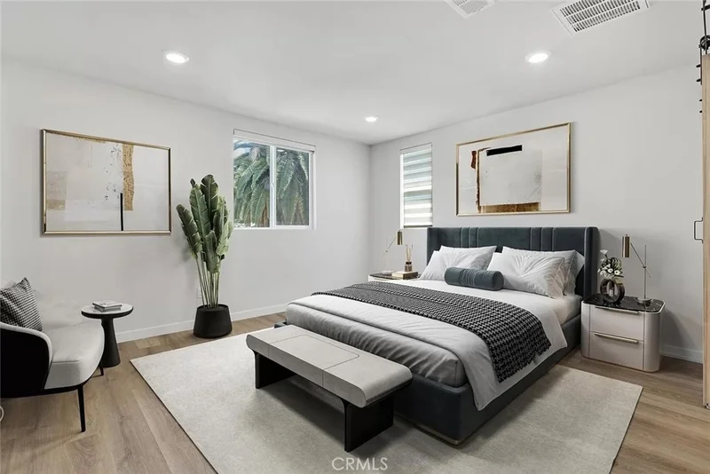 Welcome to this corner-lot three-story home located in a private gated community in Van Nuys, already fully equipped with all appliances. Hardwood flooring installed throughout the home in 2023 and newly installed solar panels greatly reduce energy costs, saving hundreds of dollars on utility bills. The entry level features a bedroom with an ensuite bathroom and direct access to a private outdoor space. The front and side yard have been professionally landscaped with artificial turf, custom gates, and tall ficus hedges for added privacy and low-maintenance living. The second floor offers a bright open-concept living area ideal for entertaining, with a kitchen featuring stainless steel appliances, an oversized walk-in pantry, and seamless flow into the spacious living room with a convenient powder room. The third floor includes the primary suite with a walk-in closet and ensuite bathroom, along with two additional bedrooms, a full bathroom, and a dedicated laundry room. Additional features include a private two-car garage with Tesla EV charger, bonus refrigerator, extra storage, pre-installed Ring security system, guest parking, and a community playground and picnic area. Conveniently located near CSUN, Los Angeles Valley College, Northridge Fashion Center, and major dining and shopping destinations.