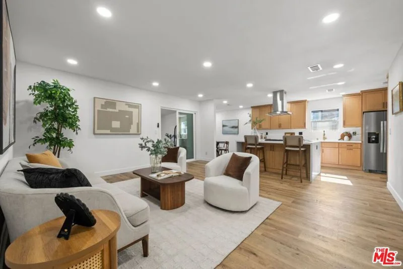 Welcome to the ultimate turnkey experience! This stunning, fully-gated modern home on a sprawling corner lot in Van Nuys offers unparalleled privacy and function perfect for a first-time buyer or growing family. Step into a bright, open-concept layout where the fully remodeled kitchen is the show-stopping heart of the home. It features a gleaming quartz waterfall island, top-of-the-line stainless steel appliances, and custom cabinetry with smart built-in USB/outlets making entertaining effortless. A formal dining area flows seamlessly from the kitchen. The versatile floor plan boasts a spacious primary suite with a luxurious en suite bath, plus two additional, well-sized bedrooms. Both bathrooms have been completely renovated for a spa-like feel. Enjoy a clean, contemporary aesthetic with new waterproof vinyl flooring, recessed lighting, and modern fans throughout. This home adapts to your life. A versatile bonus room can easily serve as a studio, playroom or fourth bedroom, complemented by a dedicated home office for remote work. The expansive, private backyard is a tranquil canvas with mature trees, ideal for al fresco dining under thoughtful dusk-to-dawn lighting. Multiple lounge areas throughout the front and back yard for maximum potential of this expansive corner lot. Every major system has been updated for comfort and efficiency: newer central HVAC (w/ Nest), a new 200-AMP electrical panel, updated plumbing, newer shingle roof, and double-pane tinted windows. Instant curb appeal is provided by the freshly painted exterior, newly paved driveway, and modern garage door. The garage is already updated with new drywall, paint, sensor lights, and an epoxy floor, making it perfectly poised for an easy ADU conversion. With the new 200 amp electrical panel and plumbing in place, you can quickly unlock potential rental income or create a private guesthouse. Parking is plentiful with a fully-gated driveway. Don't miss this opportunity to own a completely renovated Van Nuys gem!