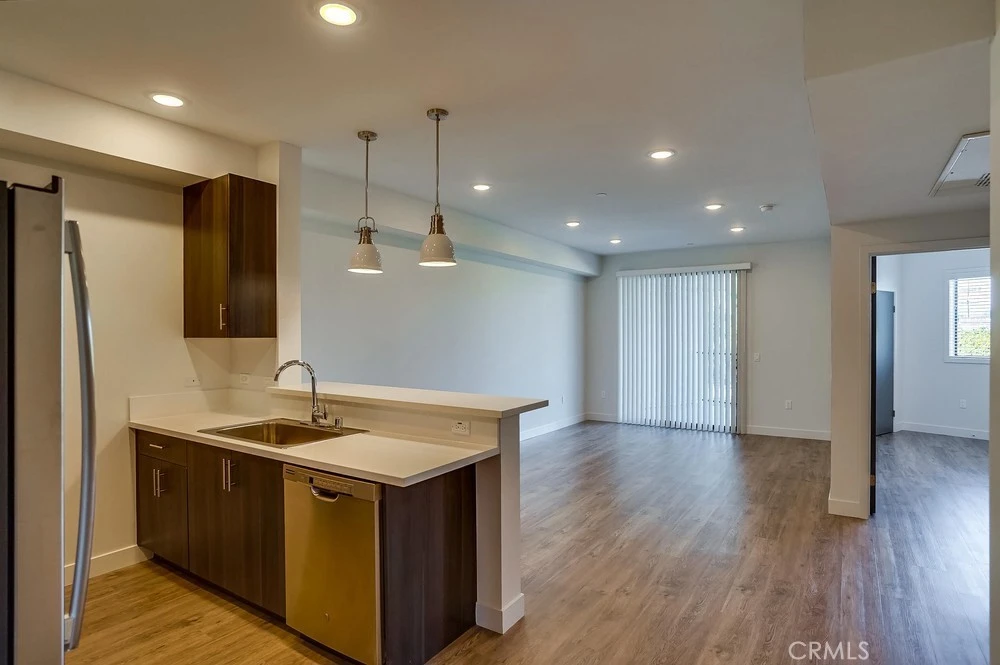 Nearly brand new construction (built in 2020) one block away from all the amazing dining, shopping and entertainment Sherman Oaks and Studio City have to offer. This incredibly updated corner unit, located away from the major streets, offers such modern amenities that include wood laminate flooring (no carpet), double pane windows, Quartz countertops, recessed LED lighting and more! The kitchen is open and offers a high breakfast bar for more casual dining. It features Quartz counters, custom cabinetry & all stainless steel GE appliances, which includes a gas range, refrigerator with pull-out bottom freezer, dishwasher and micro-hood. The living room is light, bright and spacious! It's adorned with a stylish sliding door granting you access to your private balcony that overlooks the quiet neighborhood. The LED lighting continues into the bedroom, which also offers a walk-in closet with custom built-ins. Adjacent to the bedroom rests the bathroom, complete with a spacious vanity featuring Quartz counters and plenty of storage, as well as a tub/shower combo with stylish subway tile walls and glass shower door enclosure. Lastly, you have your own in-unit FULL SIZE WASHER & DRYER! This unit comes with 1 dedicated parking space in the gated subterranean parking garage, which has EV CHARGING & is easily accessible from the nearby elevator, in addition to a community rooftop deck with sitting areas and a gas bbq.