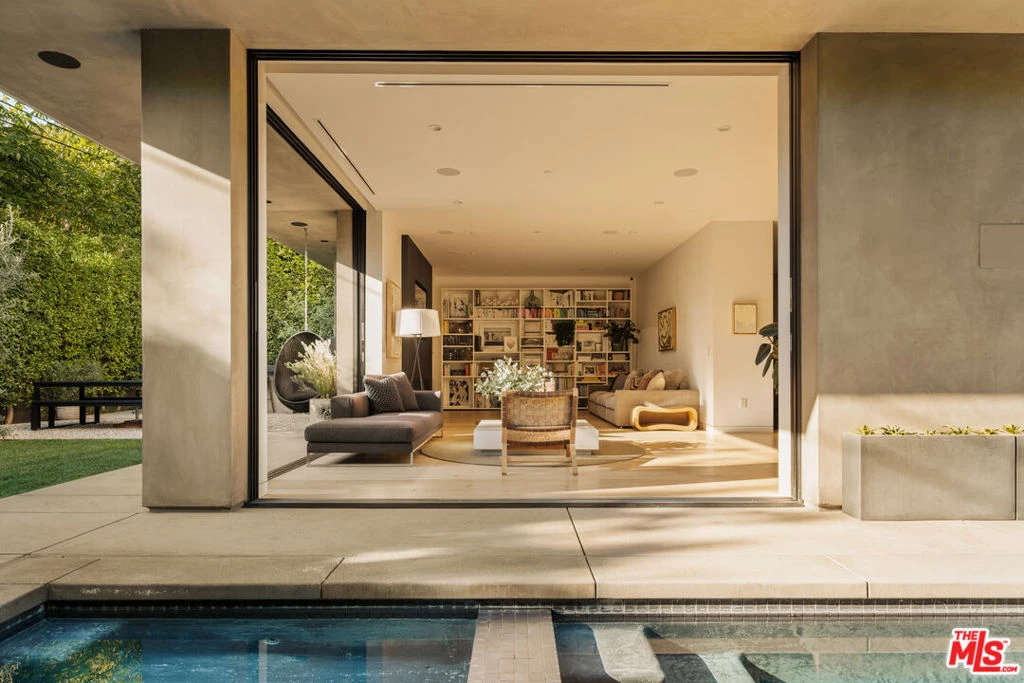 A refined expression of contemporary California architecture, this striking Venice residence has been thoughtfully enhanced and remodeled since its 2018 construction, elevating both its design integrity and livability. The sculptural facade opens to interiors defined by volume, light, and seamless spatial flow. Floor-to-ceiling Fleetwood pocket doors dissolve the boundary between indoors and out, allowing natural light to animate the home throughout the day. The open living and dining spaces unfold around a chef's kitchen appointed with premium Miele appliances, custom Italian cabinetry, and carefully curated materials that balance warmth with modern precision. The living space is punctuated by a wall of custom Porro bookshelves, with a rolling library ladder, offering a streamlined aesthetic and bespoke functionality for book enthusiasts and art collectors alike. Upstairs, three bedroom suites offer privacy and comfort, including a dramatic primary retreat that opens to a private terrace. The Roman clay finished fireplace, generous walk-in closet, and spa-inspired bath complete the suite, creating a true sanctuary within the home. Outdoor living is equally compelling. The backyard features a striking 54-foot saltwater lap pool and spa framed by lounge areas designed for both quiet afternoons and vibrant entertaining. An outdoor kitchen and dining pavilion extend the living experience into the landscape, creating an effortless rhythm between architecture and environment. Above it all, a rooftop deck captures sunset skies and ocean breezes, offering an elevated setting for evening gatherings. Gated and private with a two-car garage and additional off-street parking, the home is ideally located just moments from Abbot Kinney's renowned dining and boutiques, the beach, and neighborhood amenities including Penmar Park and golf course.