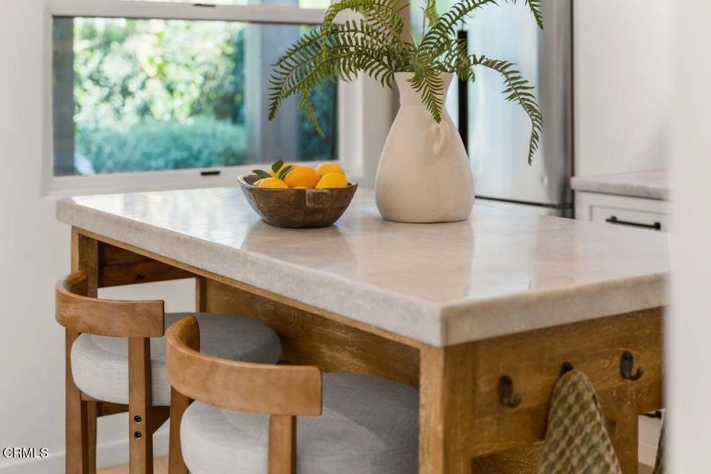 Tucked into Ventura's emerging Arts District and just one mile from the coastline, this inviting beach bungalow offers a relaxed, connected lifestyle close to everything that makes the area special. Ocean breezes, the nearby bike path to the beach and Ojai, and the creative neighborhood energy shape everyday living here.Inside, the two-bedroom, one-bath layout feels bright and uplifting, with vaulted ceilings and abundant natural light enhancing the home's open, airy character. Beautiful designer-selected finishes elevate each space, blending comfort with a polished coastal aesthetic. Mini-split HVAC systems provide efficient, customizable climate control--keeping the home cool in the summer and comfortably warm through the winter months.The kitchen showcases a timeless, classic design with marble countertops, matte black fixtures, and high ceilings finished in shiplap for subtle architectural charm. It feels both refined and relaxed--perfectly suited to the home's beachside setting. The bathroom offers a modern aesthetic with clean lines, thoughtfully selected materials, and finishes that add warmth and sophistication to the fresh, updated space.A solid wood entry door and privacy wall create a warm sense of arrival, while the private, enclosed driveway enhances both convenience and privacy. Outdoors, the backyard is designed for gathering and unwinding, with space to dine al fresco, a cozy fire pit area for evenings under the stars, and a storage shed for added functionality. Two Trex patios with pergolas provide additional areas for lounging or entertaining. The finished garage offers a Tesla charger and flexibility for hobbies, storage, or a creative workspace. Mature lemon, avocado, and orange trees complete the setting--an authentic slice of Ventura living just moments from the shore.