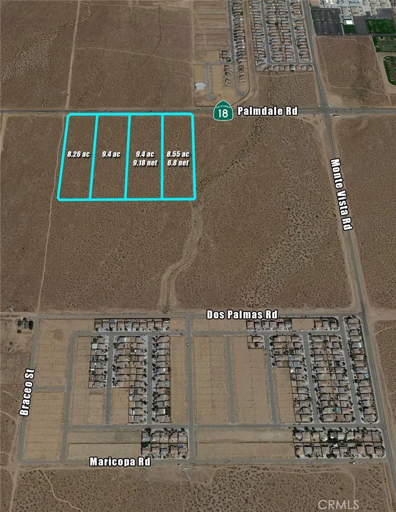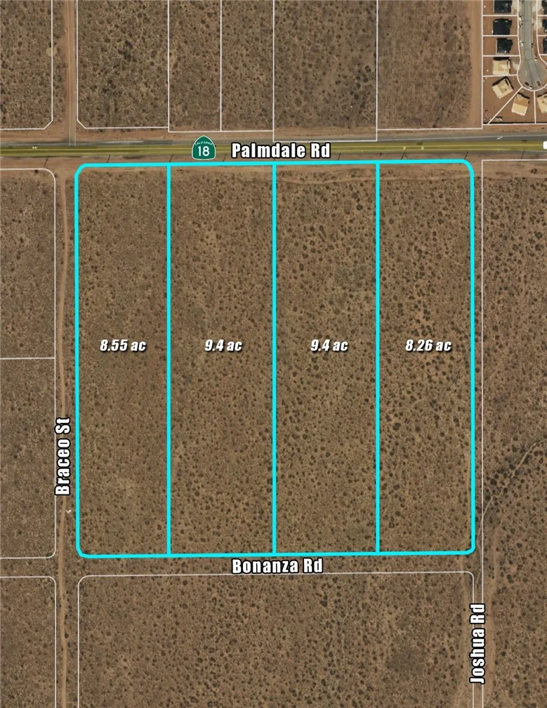 35.61 ac PUD (Planned Unit Development) land located at the Southeast corner of Palmdale Rd/Hwy 18 and Braceo St in the City of Victorville. PUD is designated for Medium Density Residential, allowing 12-20 units per acre. Listing consists of four parcels, bordered by Palmdale Rd (Hwy 18), Braceo St, Bonanza Rd and Joshua Rd. Pacific Communities and KB Home are currently building around the corner off Monte Vista Rd. Multiple Tentative and Final Maps being processed in the area, prepping this section of West Victorville for strong future growth. Easy access to Hwy 395 and I-15 to the East and a short distance from Hwy 138 to the West. There is a big need for multi-family development in the High Desert, and this property provides a good location, close proximity to local shopping needs and inclusion in a great school district (Snowline).