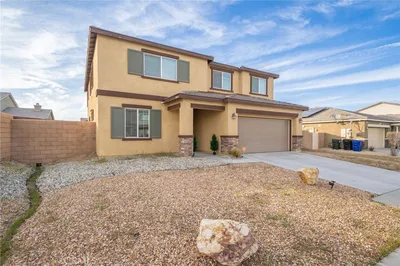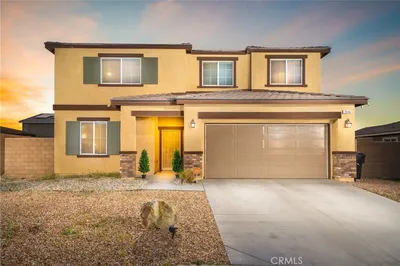 TURN KEY MULTI GENERATIONAL HOME WITH SOLAR IN DIAMOND RIDGE. Built in 2020 by Frontier Homes, this spacious and thoughtfully designed single-family residence offers a blend of modern comfort, functionality, and location. Featuring 5 bedrooms, 4 bathrooms, and approximately 2,915 square feet on a 7,300 square foot lot, this home provides ample room for everyday living and entertaining. A large open-concept great room welcomes you upon entry, seamlessly connecting the kitchen, dining, and living areas. Filled with natural light, this space feels open and inviting. The kitchen features granite countertops, a walk-in pantry, and pendant lighting over a generous island—ideal for meal prep or casual dining. The adjacent dining area makes hosting easy and convenient. Wide plank laminate wood flooring runs throughout the main living areas, offering both style and durability. The home also includes over $11,000 in builder upgrades, including flooring and window coverings. The versatile floorplan includes two downstairs bedrooms—one with an en-suite bathroom—ideal for guests or in-law living. Upstairs, a spacious loft offers flexibility for a media room, workspace, or additional living area. The primary suite features a large walk-in closet and an en-suite bathroom with dual vanities, a separate tub, and shower. Two additional bedrooms and an upstairs laundry room complete the upper level. The backyard is designed for both enjoyment and low maintenance, featuring artificial turf, a large storage shed, and a variety of fruit trees including grapes, pears, figs, peaches, apples, plums, and watermelon. Additional highlights include a two-car attached garage, extended driveway for extra parking, and NO HOA. A solar system at $157 per month helps keep electricity costs low. Ideally located less than one mile from Vista Verde Elementary, under two miles from Silverado High School, and one mile from Mesa Linda Park. Adelanto Marketplace—featuring Stater Bros., Starbucks, Walmart, and more—is just 1.5 miles away.