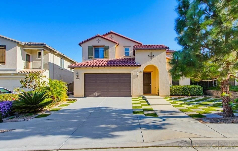 This gorgeous 5-bedroom home in the gated Laurel Pointe community features a highly desirable open-concept floor plan and paid-off solar panels that add both value and charm. The first-floor primary suite boasts a spa-like bath, a large walk-in closet with custom organizers, and custom finishes throughout. A den on the main level and four additional bedrooms upstairs, including a private suite, offer ample living space. Vaulted ceilings and abundant high windows fill the home with natural light, creating a warm and airy feel. Designed for entertaining, the gourmet kitchen opens to the great room and includes a center island, white cabinetry with European concealed hinges, neutral quartz countertops, stainless-steel oven, 5-burner gas cooktop, and built-in microwave. A stunning custom built-in cabinet in the dining room provides additional storage. Additional upgrades include beautifully updated wood flooring throughout the foyer and first floor, bullnose drywall corners, elegant baseboards, and an interior laundry room with countertop plus a convenient mudroom area. Upgrades abound inside and out, along with a 2-car garage and a stunning backyard. The exterior showcases thoughtfully designed landscaping with a unique grass checkerboard front yard, custom pavers, a covered patio, fruit trees, a fire pit, colorful succulents, and a tranquil waterfall, perfect for relaxing or hosting. Ideally located just eight miles from the beach and close to freeways, dining, shopping, schools, and Vista Sports Park.