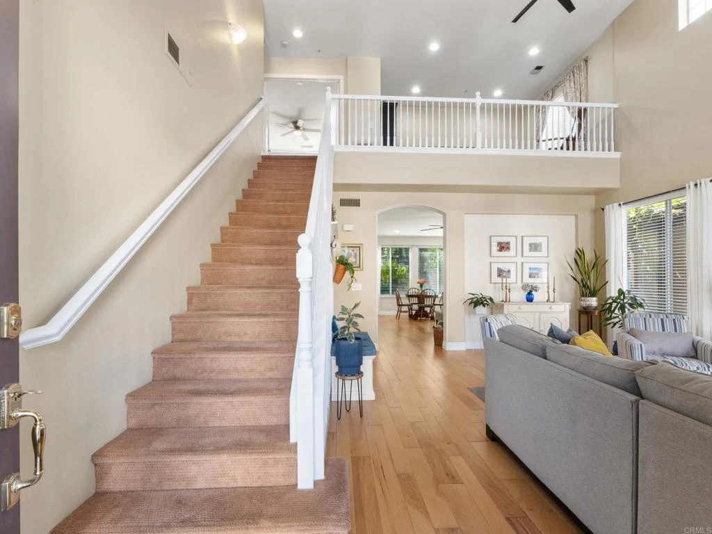 Welcome to the gated community of Heritage & Legends in the highly sought-after Shadowridge neighborhood. This beautifully maintained single-family home offers the largest floorplan in this community with 1,714 sq ft of comfortable living space. As you enter the home, you are greeted by an abundance of natural light pouring in from the many windows creating an open and airy atmosphere. The expansive living room features vaulted ceilings, a remodeled gas fireplace and engineered wood floors. The upgraded kitchen is designed for both function and style, featuring soft-close cabinetry, granite countertops, a single bowl sink, stainless steel appliances, a 5-burner gas stove, large center island, and abundant cabinet and pantry storage. The room adjacent to the kitchen can be used as a family room, dining room or both, and features wood floors and a slider out to the backyard. There is also a half bath downstairs offering added convenience for guests. Upstairs you will find all 3 bedrooms plus a loft – perfect for a home office, library, playroom, or space to add a 4th bedroom. The primary bedroom features an en-suite bath with dual sinks, a shower/tub combo, and spacious walk-in closet. Most windows throughout the home have been upgraded to vinyl dual pane, enhancing both energy efficiency and aesthetics. Step outside to the lushly landscaped backyard complete with a spacious patio cover—ideal for relaxing or entertaining in a private and tranquil setting. Additional highlights include a 2-car garage with ample storage space plus room to park 2 cars in the driveway. HOA dues cover front yard landscaping and common area maintenance as well as the two gated entrances into the community. Just across the street is the beautiful Buena Vista Park featuring a duck pond, multiple walking trails, and reservable space for group events and outings. Located approximately seven miles from the coast with convenient access to Highway 78, shopping, dining, schools, and the Shadowridge Golf Course, this home offers both comfort and convenience in one of Vista’s most desirable neighborhoods.