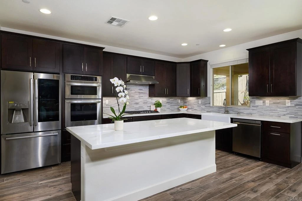 Nestled within the prestigious gated community of Laurel Pointe in Vista, this exceptional residence is ideally positioned on a quiet cul-de-sac, offering both privacy & exclusivity. Spanning approximately 3,368 square feet, the thoughtfully designed floor plan provides generous space for comfortable living & effortless entertaining. The home features 4 spacious BR, a versatile den, 2.5 BA, & a 3-car garage. Multiple living areas- including a formal living & dining room, a welcoming family room, a casual eat-in family room, & a casual eat-in kitchen- offer flexibility for everyday living & special gatherings. A dedicated craft or workspace adds additional functionality, perfect for a home office, study area, or creative retreat. Move-in ready, the home showcases a freshly painted interior & numerous 2024 upgrades. The beautifully updated kitchen features quartz countertops, a larger center island, stainless steel appliances, a striking glass backsplash, a farmhouse sink & touchless faucet, Espresso-stained cabinetry w/soft-close features, a corner storage cabinet, & an integrated trash system, combining style with practicality. Upgraded tile plank flooring throughout the main level & upgraded carpeting upstairs, enhancing both comfort & design. The private, low-maintenance backyard is designed for relaxation & entertaining, featuring turf, pavers, & a spacious covered patio with recessed lighting. With no rear neighbors, the setting offers a rare sense of peace and openness. Residents of Laurel Pointe enjoy gated security, private walking paths w/views of the Antiques Steam Engine Museum, & a community play area. Conveniently located near top-rate schools, shopping, dining, parks, and with easy access to Highways 76 and 78, this home is also approximately 10 miles from the beach. A rare opportunity to own one of Vista's most desirable gated communities- this is a home you won't want to miss.