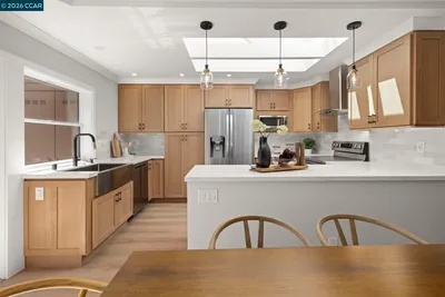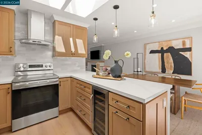 Gallo and Associates presents this beautifully redesigned and remodeled home with high-end finishes and abundant natural light. The custom kitchen features an expansive skylight, American white oak shaker cabinetry, quartz countertops, and new LG stainless steel appliances, including a wine refrigerator. The living room offers a large electric fireplace with custom shiplap surround, solid oak mantel, built-in cabinetry, and TV/HDMI hookups. The expanded primary suite includes a spa-inspired bath with custom marble shower, dual showerheads, skylight, and mirrored closet doors. The guest bedroom features a large reach-in closet, while the updated guest bath offers a marble tub surround, skylight, and additional storage. Additional highlights include recessed LED lighting, coved ceilings, bedrooms prewired for ceiling fans, a laundry closet with GE laundry center, new double-pane windows and French doors, central HVAC with new ductwork, USB-equipped outlets, and a new electrical subpanel. Enjoy a private rear brick courtyard with French doors and a separate entry garden with tile and custom steel gate. All work permitted by Rossmoor MOD and the City of Walnut Creek.