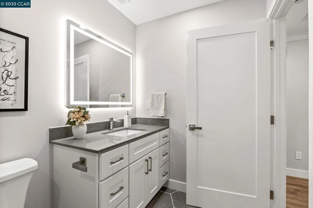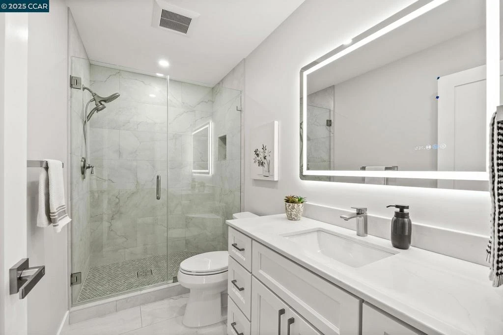 Beautifully remodeled by Rossmoor Renovations, this reconfigured 2 bedroom / 2 bath single-row, level-in, end-unit San Franciscan offers partial, tree-framed views of Mount Diablo with ample guest parking right in front of the home. The front patio and private courtyard have been upgraded with new tile, creating seamless indoor-outdoor living and a perfect space to relax or entertain. Inside, the elegant open floor plan seamlessly connects the kitchen, dining, and living areas. The designer kitchen features a quartz waterfall island, custom cabinetry, a full suite of stainless steel appliances, and an in-unit washer/dryer. Tray ceilings and recessed lighting enhance the spacious living room with fireplace and custom wainscoting. The bathrooms are spa-inspired with frameless glass showers, designer tile, seating, and elegant vanities. All windows are double-pane Andersen windows, and every finish in this home was carefully selected with no expense spared. Come experience this luxury Rossmoor retreat—a rare opportunity to own a truly unique San Franciscan.
