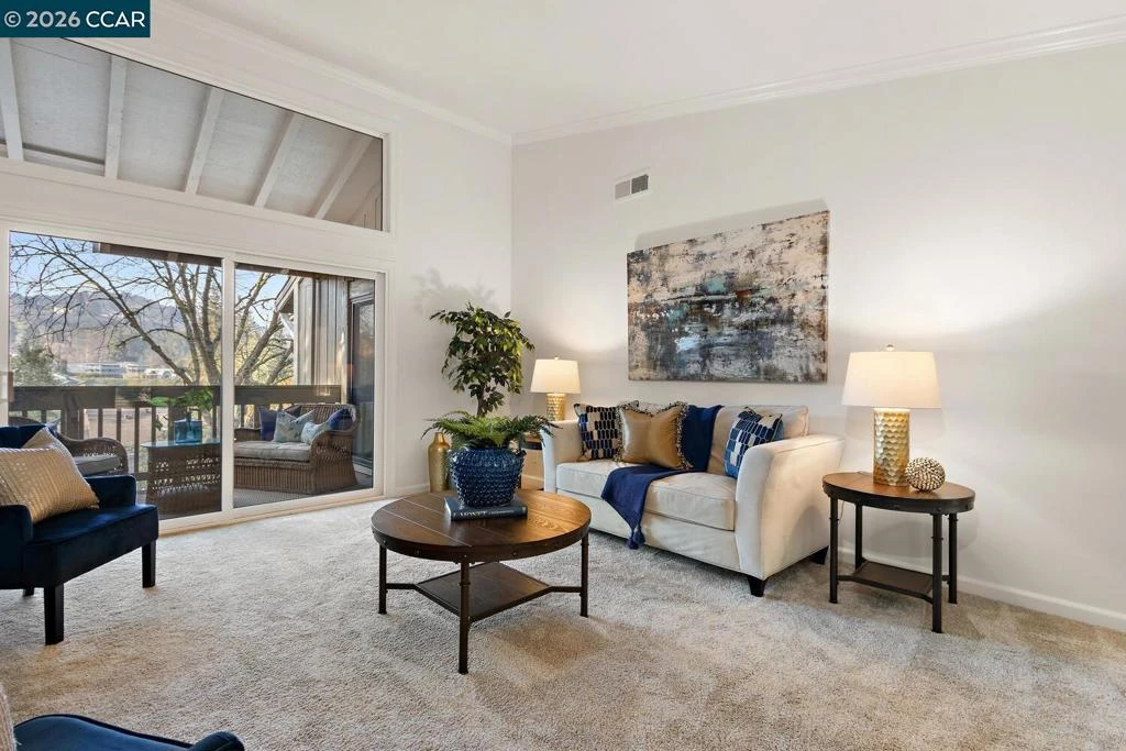 BIG REDUCTION! Beautiful updated upper-level Sierra condo. Bright and spacious. Vaulted ceilings. New interior paint. Large two bedrooms with good size closets. Large balcony with pleasant views. Newer dual pane windows. Newer heater & A/C. Newer carpet. Crown molding throughout. Windows & patio shutters. Recessed lighting. Double sink vanity in master bath. Three rooms access to large balcony. One car garage & secure storage. Newer side door into garage (next to steps). Level short walk to Creekside clubhouse, Event Center, golf course, pickleball courts, restaurant. This condo is located in the gated Rossmoor active adult community 55+. This beautiful home is ready for you! Call me for a private tour.