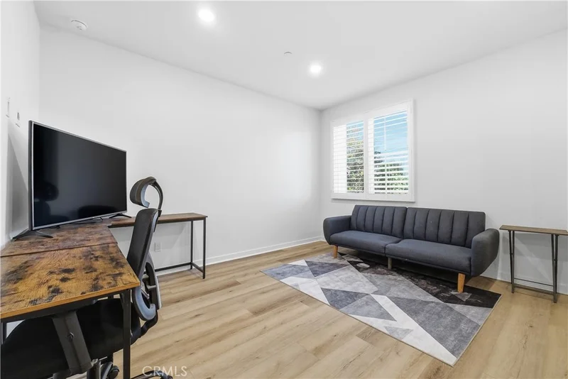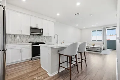 This 2025-built, two-story townhome at The Grove at Merced stands out for its clean layout, efficient use of space, and low-maintenance design. A fully landscaped front patio provides a genuinely usable outdoor area, well-suited for quiet mornings or relaxed evenings. The main level is designed with clarity and flow in mind. The living, dining, and kitchen areas connect naturally, creating an open feel without wasted space. The kitchen features quartz countertops, shaker-style cabinetry, a generous peninsula for seating, and a full suite of appliances, including a refrigerator, range, microwave, and dishwasher. LVP flooring throughout the main floor adds durability while maintaining a modern, streamlined look. A discreet powder room is conveniently positioned for guests without interrupting the living space. Upstairs, all three bedrooms are separated from the main living areas, offering added privacy and a quieter environment. The primary suite is well proportioned, comfortably accommodating full-size furniture, and includes a walk-in closet and an en-suite bath with dual sinks and a walk-in shower. Two additional bedrooms share a full bathroom, while the upstairs laundry area is thoughtfully placed to support everyday routines. The attached 2-car garage provides both parking and storage and is EV-charging ready. Additional features include dual-pane windows, a tankless water heater, and smart-home pre-wiring for a programmable thermostat and video doorbell. Solar panels offer long-term energy efficiency. With an open floor plan, modern finishes, and minimal maintenance requirements, this home is well-suited for buyers seeking a newer construction lifestyle in a convenient West Covina location. Community amenities, including BBQ areas and picnic spaces, further enhance everyday livability.
