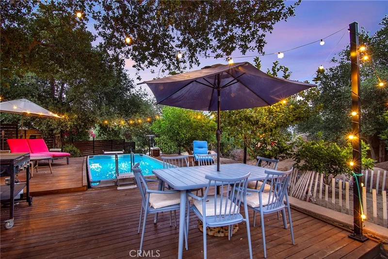 This Spanish adobe residence is situated on a sandstone ridge in West Hills, offering unobstructed 360-degree views of the San Fernando Valley and surrounding canyon terrain. The home includes 3 bedrooms and 3 full bathrooms across an open-concept layout featuring vaulted ceilings with exposed wood beams. Interior living spaces connect directly to the outdoors through expansive sliding glass doors, opening to a wraparound deck, sun deck, and an above-ground pool with custom wood decking integrated into the landscape. Multiple outdoor areas provide defined spaces for dining, lounging, and enjoying panoramic valley and canyon views beneath mature trees. Recent upgrades include solar panels, a 200-amp electrical panel, landscape lighting, and a dedicated electrical panel serving the pool area. The property is fully fenced with Mangaris wood and includes two storage sheds, a one-car detached garage with adjacent carport, and additional on-site parking. Technology features include five Ring security cameras, a remote-controlled thermostat, a WiFi-enabled front gate deadbolt, and a mesh Wi-Fi system supporting indoor and outdoor coverage. Additional property features include mature oak trees and a main sewer connection (no septic). Located at the end of a no-through street, the property offers privacy and direct access to nearby hiking trails, combining architectural character, elevated views, outdoor living spaces, and modern systems.