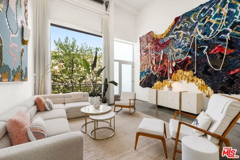 Rare opportunity at 950 Art Lofts in the heart of West Hollywood. This architectural townhouse features soaring 18-ft ceilings, an oversized industrial roll-up window, and striking custom glass-and-steel details. Polished concrete and bamboo floors flow through the open floor plan, anchored by a European-style kitchen with high-end appliances and designer finishes. Flexible mezzanine space, two primary suites with custom closets and spa-inspired baths, plus a bonus room for a third bedroom or office. Top-floor suite opens to a private patio with panoramic views of the Hollywood Hills, and the Hollywood sign. Central air, guest parking, and move-in ready. Walkable to the city's finest dining, shopping, and nightlife. Set in West Hollywood's most walkable enclave, residents enjoy effortless access to dining, shopping, and nightlife, with six artisanal coffee houses just steps from your door.