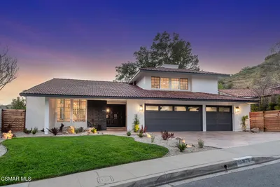 Step into this gorgeous, completely remodeled modern masterpiece located in the heart of Foxmoor, one of Westlake Village's most coveted neighborhoods. Situated on a peaceful cul-de-sac RIGHT NEXT to the greenbelt, this home has been fully upgraded from top to bottom with a fresh modern aesthetic and recreated to illustrate the California lifestyle, with seamless indoor-outdoor living and entertaining at its absolute best! As you approach, you are welcomed by the BRAND NEW charcoal paver driveway and walkway with lush green landscaping. The flooring in this home is European white oak engineered wood with wide 9'' planks and NEW custom cabinetry all throughout. The expansive entryway reveals soaring ceilings, a beautiful modern gold light chandelier, marvelous white oak staircase and a new open concept design. The exquisite designer kitchen is a chef's dream, boasting Vadara quartz countertops, high-end Viking appliances, and a massive island with waterfall edges. Harmonious indoor-outdoor entertaining awaits with spacious living and dining areas that open through bifold doors to a beautifully landscaped backyard. Completing the first floor is a full bath with a newly added standing shower, office and laundry room, leading into the finished garage with crisp epoxy floors. Upstairs you will love the spacious primary suite, plus three bedrooms, and secondary bathroom. The primary suite is equipped with vaulted ceilings, 2 large closets, a newly expanded and reimagined spa-like primary bathroom with a huge walk-in shower, double vanity and make-up station. Enjoy peace of mind with fully permitted upgrades to the electrical, plumbing, and HVAC systems. This home is just steps away from award-winning Westlake Elementary, with wonderful shopping and restaurants close by. Experience luxury living where no expense was spared. Welcome to your new home!